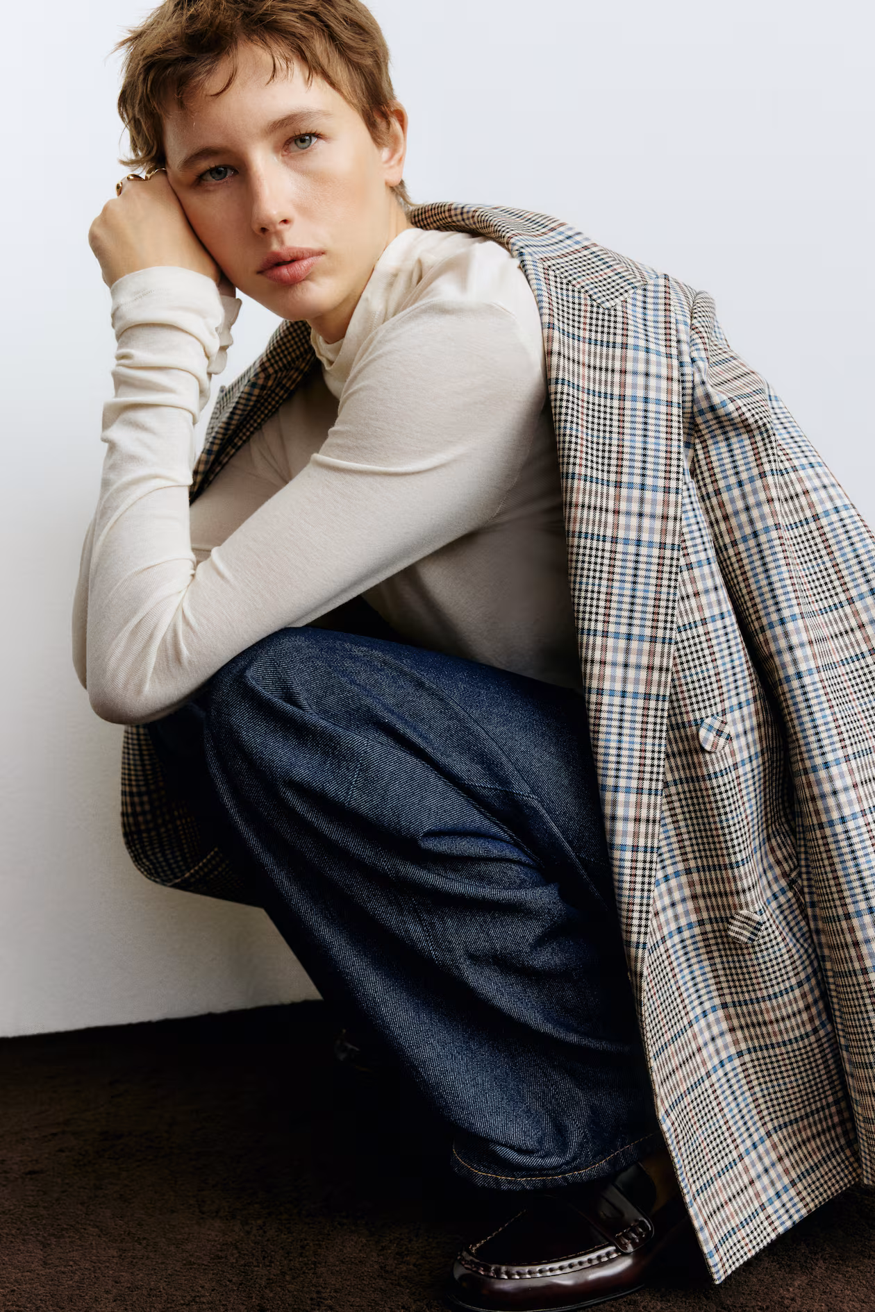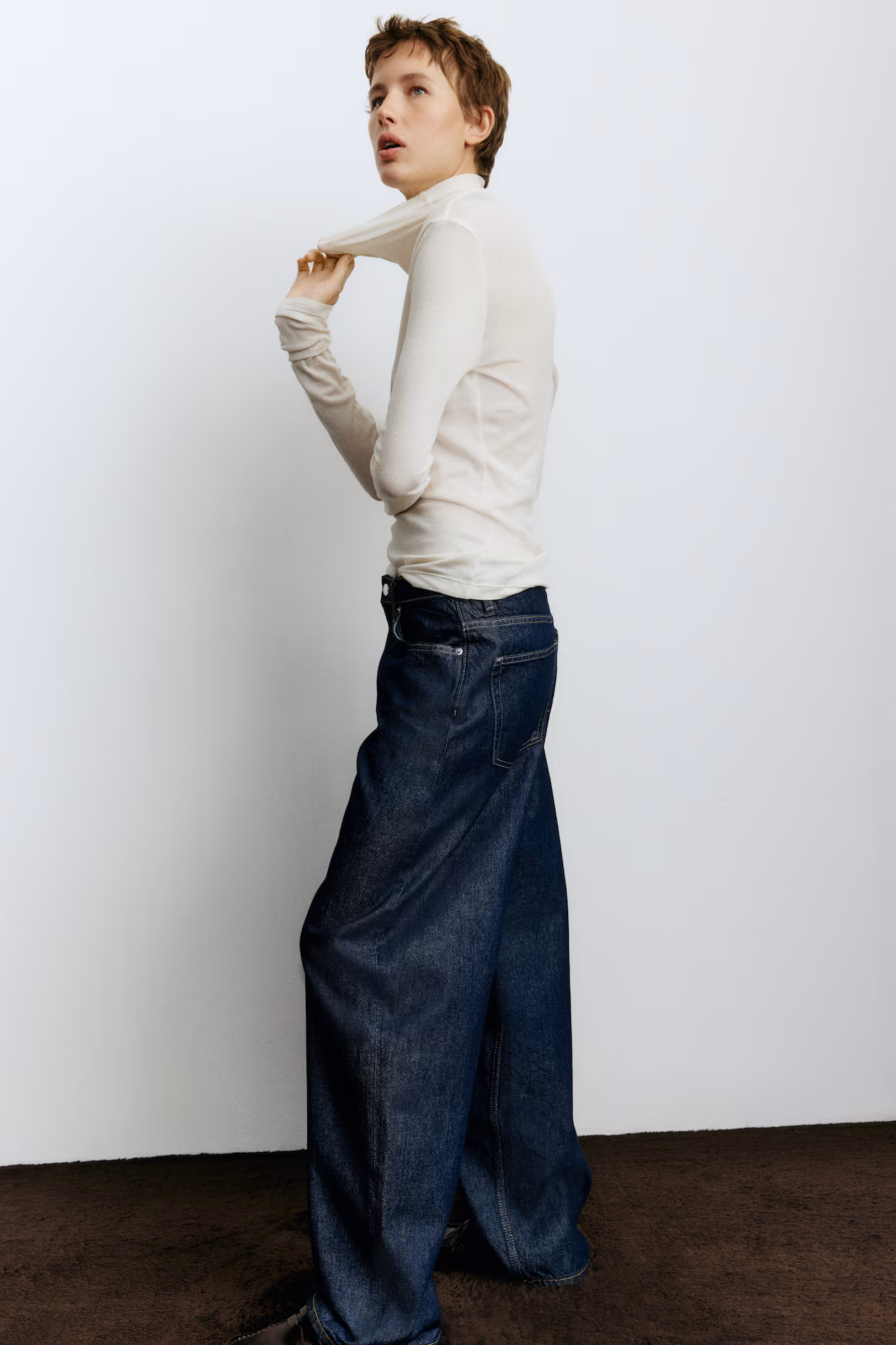 5-pocket jeans in cotton denim. Loose fit from hip to thigh and a baggy, tapered fit from thigh to hem. High waist, zip fly with button, and curved, voluminous legs.