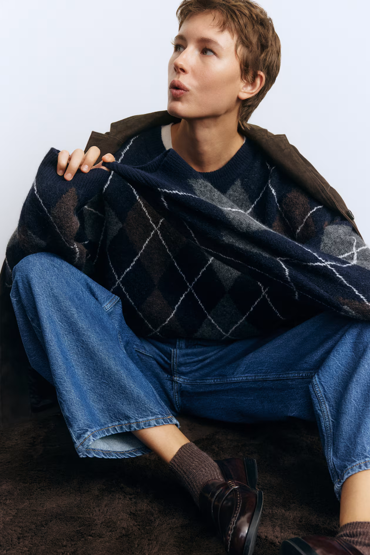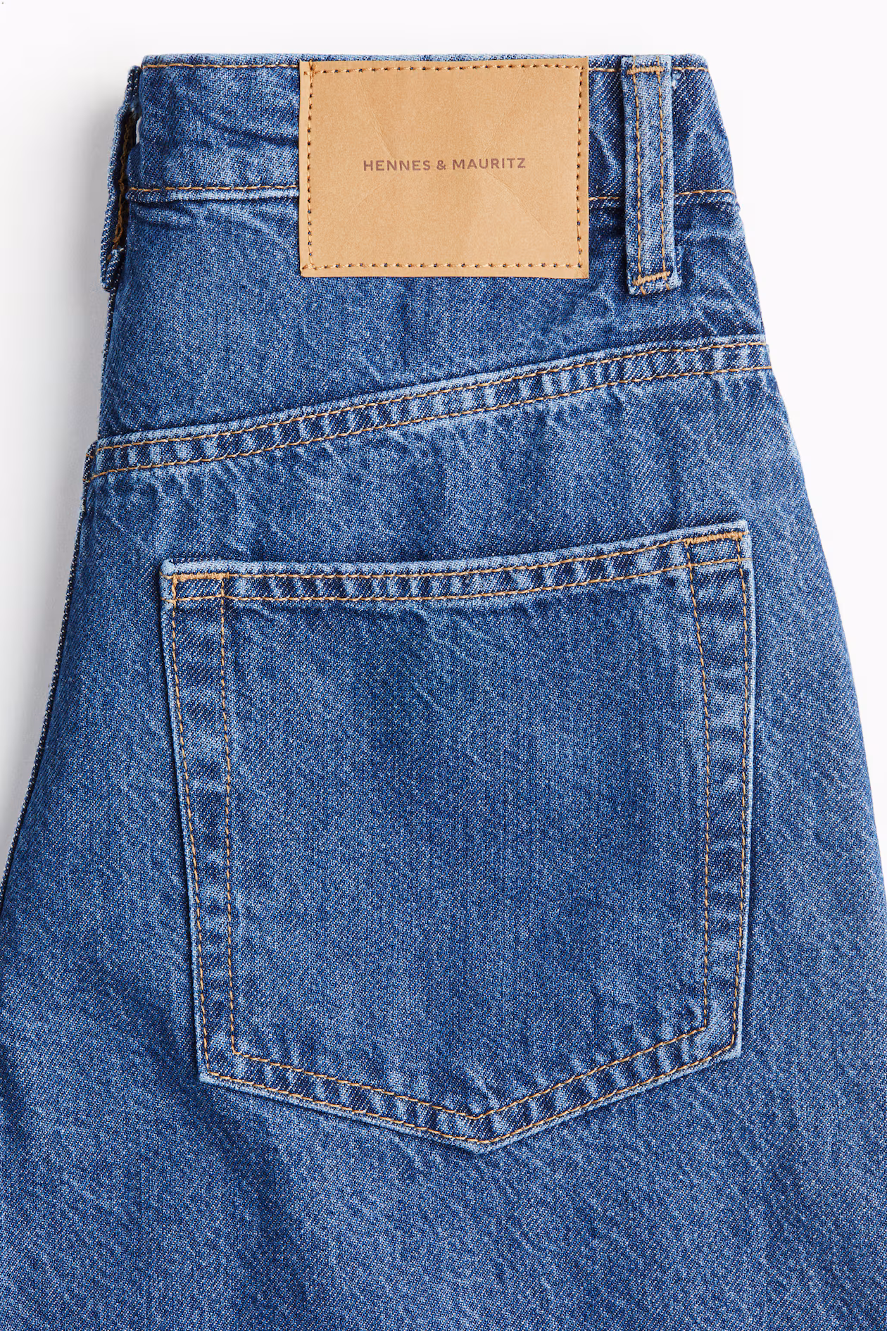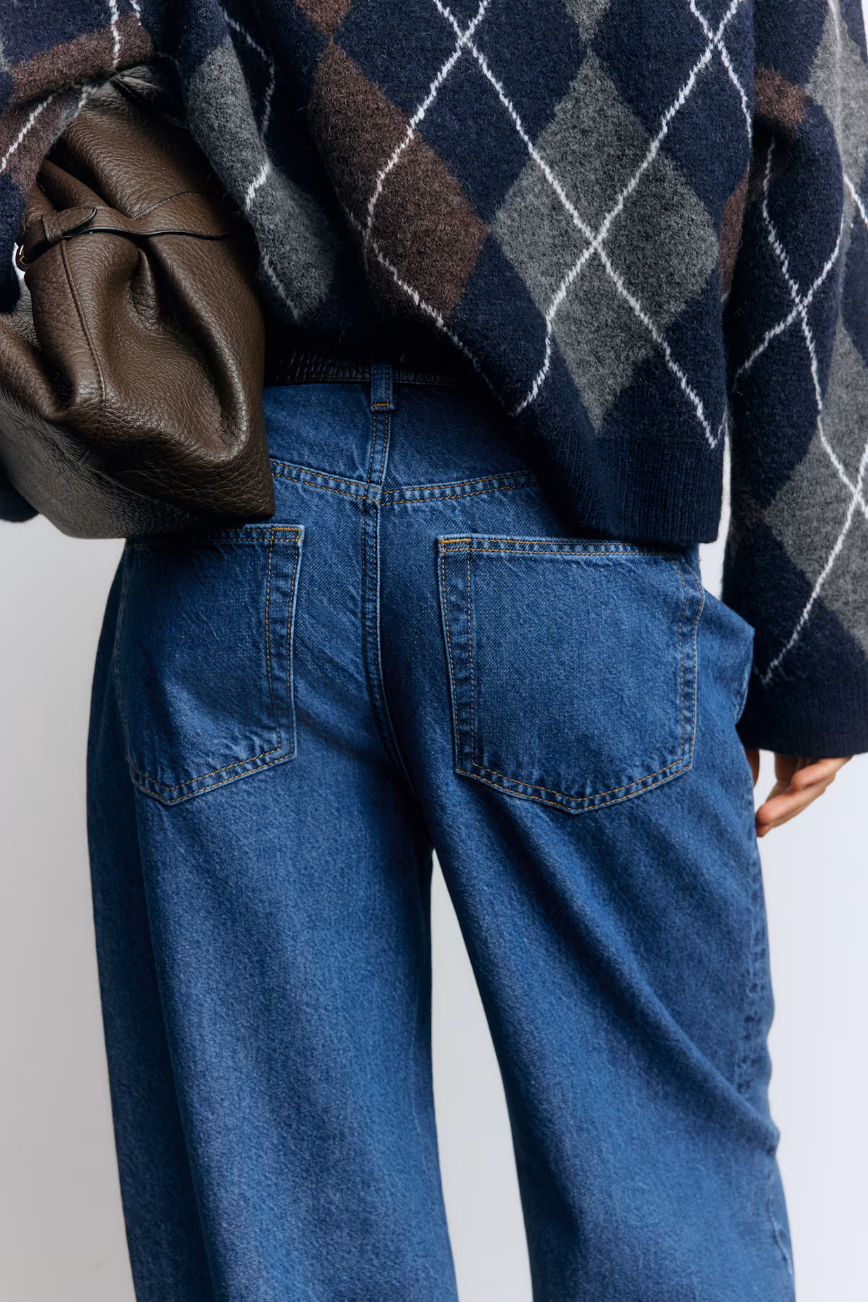 5-pocket jeans in cotton denim. Loose fit from hip to thigh and a baggy, tapered fit from thigh to hem. High waist, zip fly with button, and curved, voluminous legs.