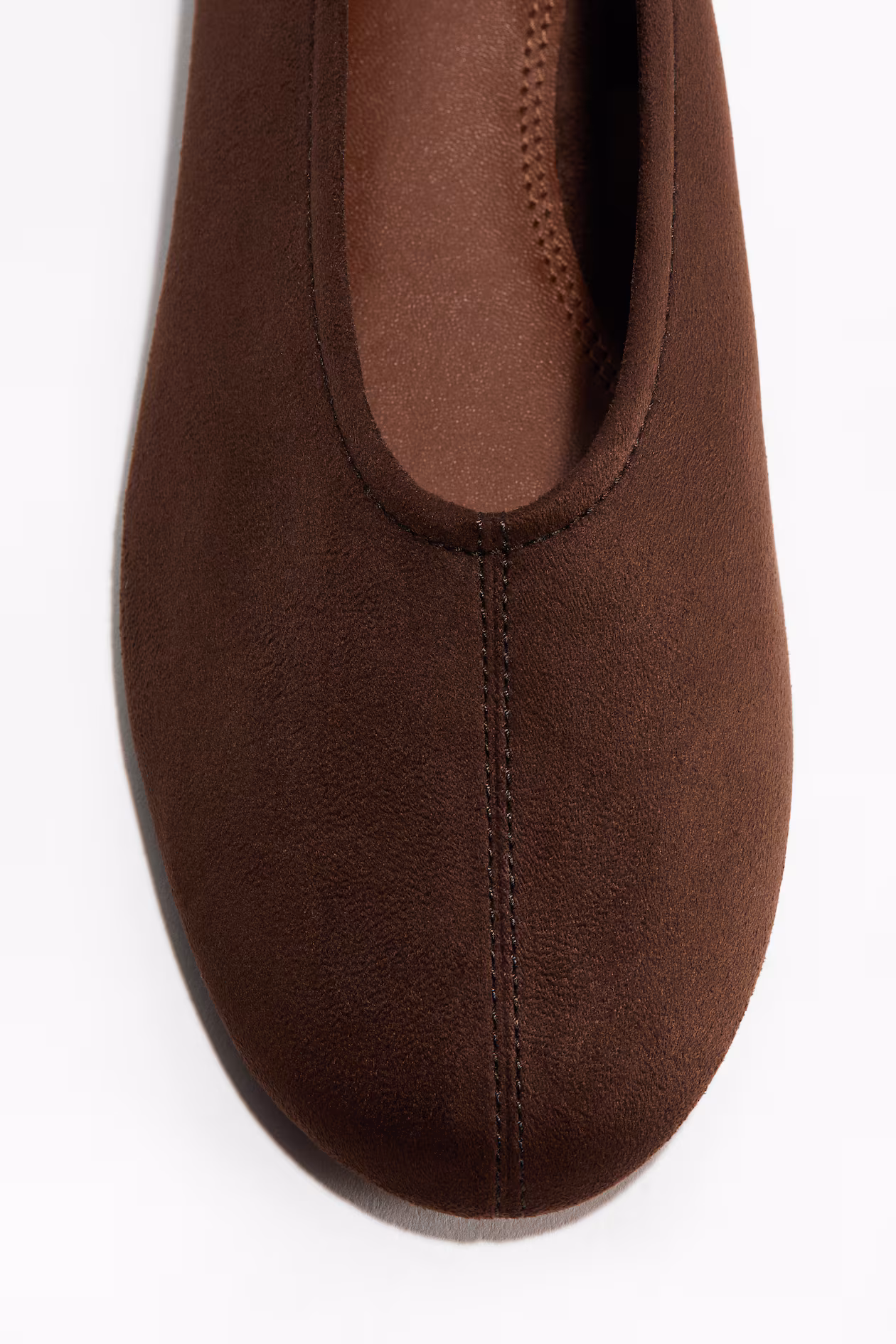 Ballet flats with a soft, napped finish. Rounded toes, a visible seam at front, and a loop at back. Jersey lining.