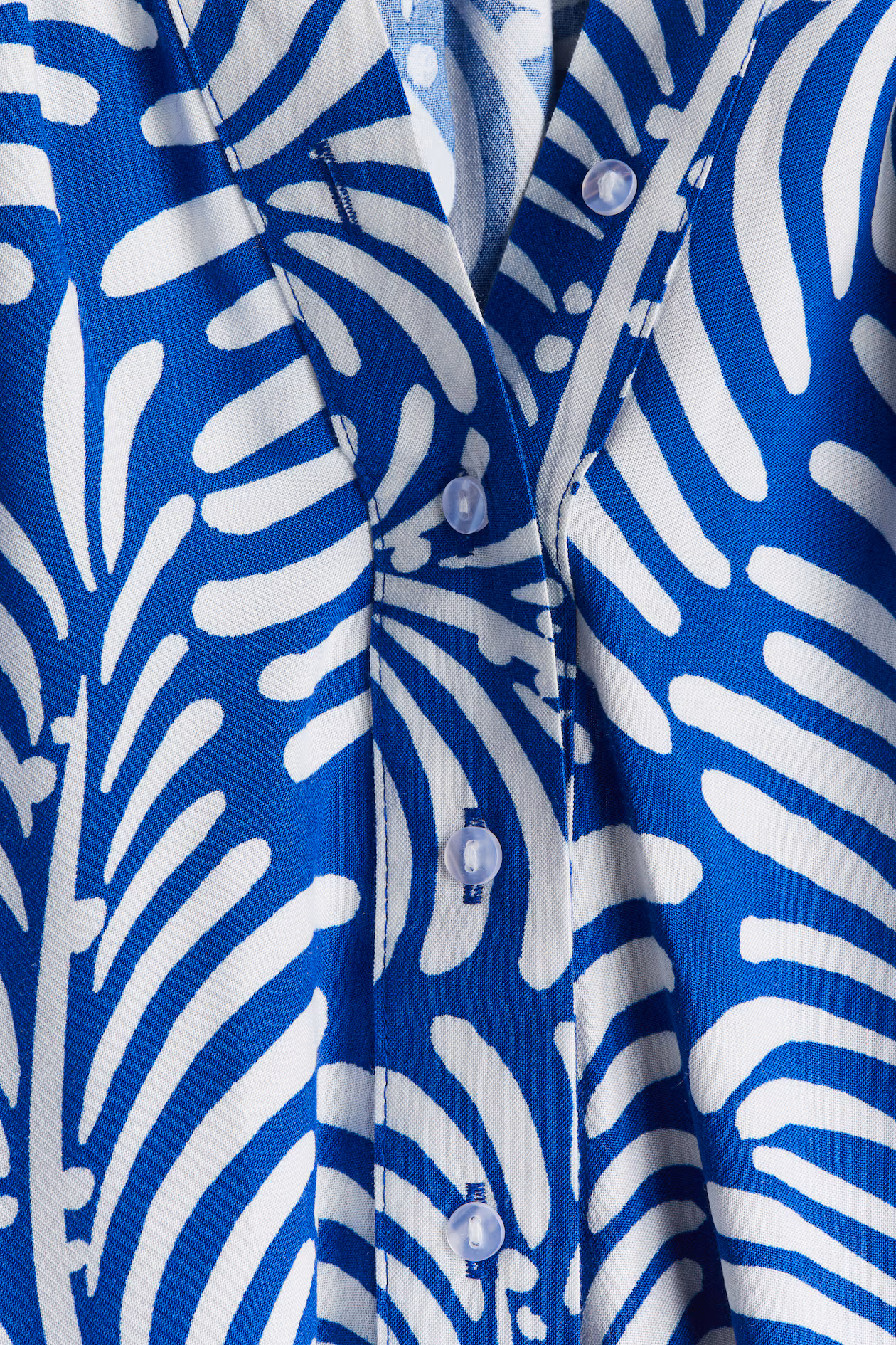 Blouse in airy, woven fabric. Low collar with gathers, button placket at front, long, voluminous, raglan-cut balloon sleeves, and narrow cuffs with button.