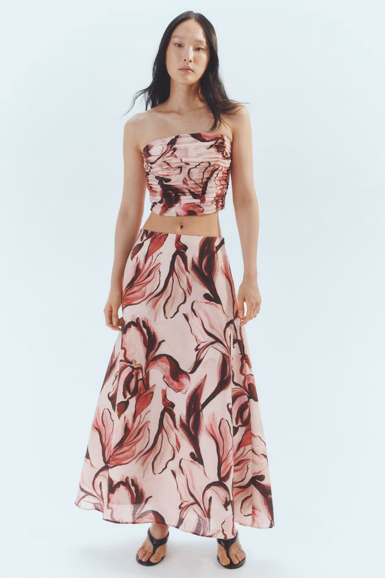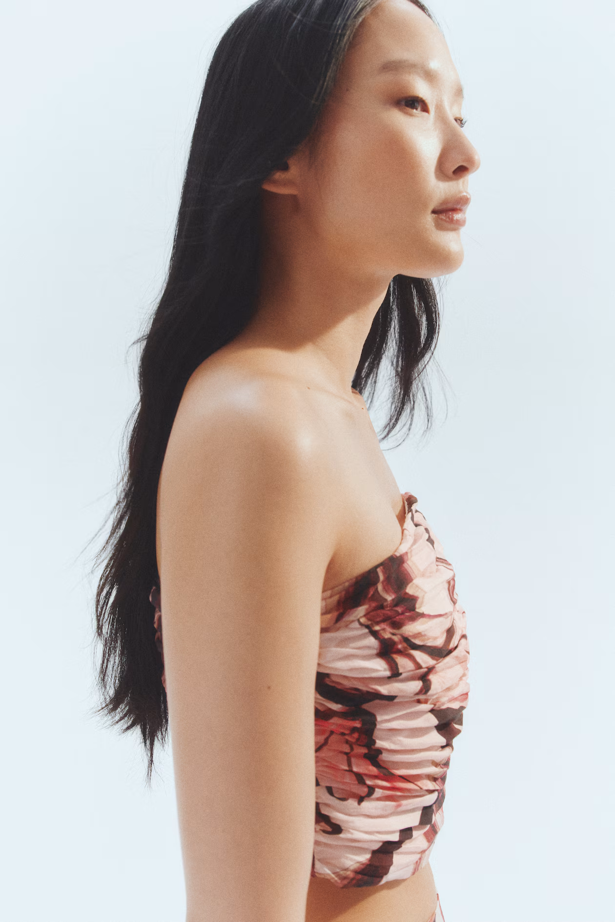 Bandeau crop top in a woven lyocell blend with a printed pattern. Boning at front for shaping and support, gathered side seams for a draped effect, and a concealed zipper at one side with hook-and-eye fastener. Lined.