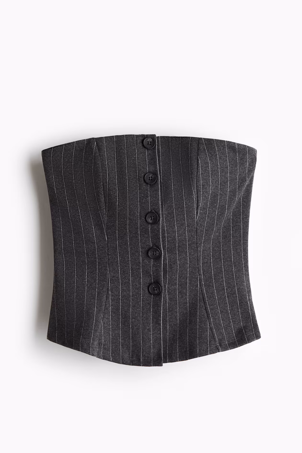 Short, fitted bandeau vest in thick interlock jersey. Straight neckline, silicone trim inside upper edge, and buttons at front.