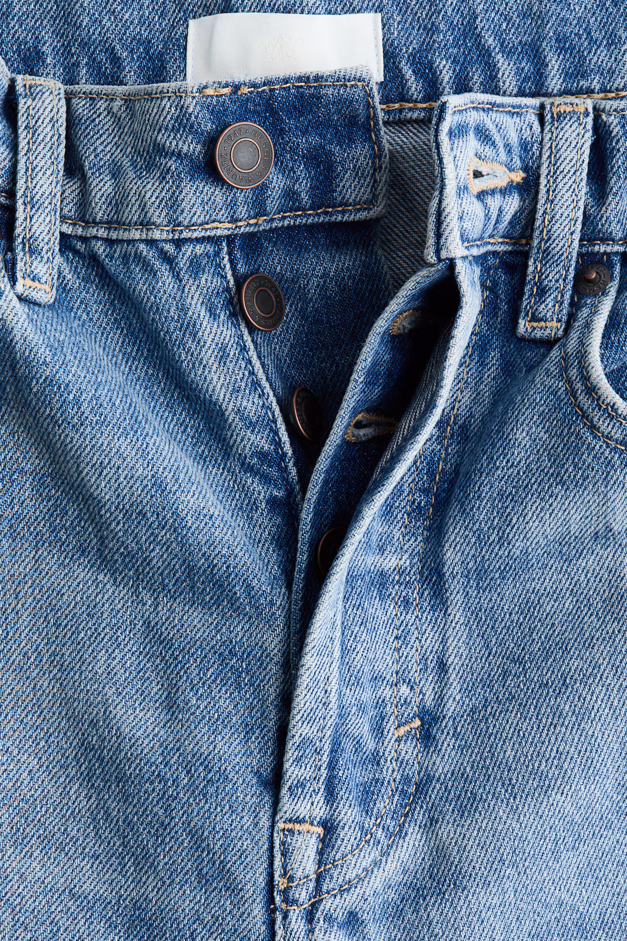 5-pocket jeans in rigid cotton denim that feels firm at first but then softens and loosens with wear. Curved, voluminous leg with a regular fit from the hip to the thigh, that tapers to the hem. High waist with a button fly, and creases down the front and back. Ankle length, designed to hit at the ankle bone. A relaxed and cool denim statement.
