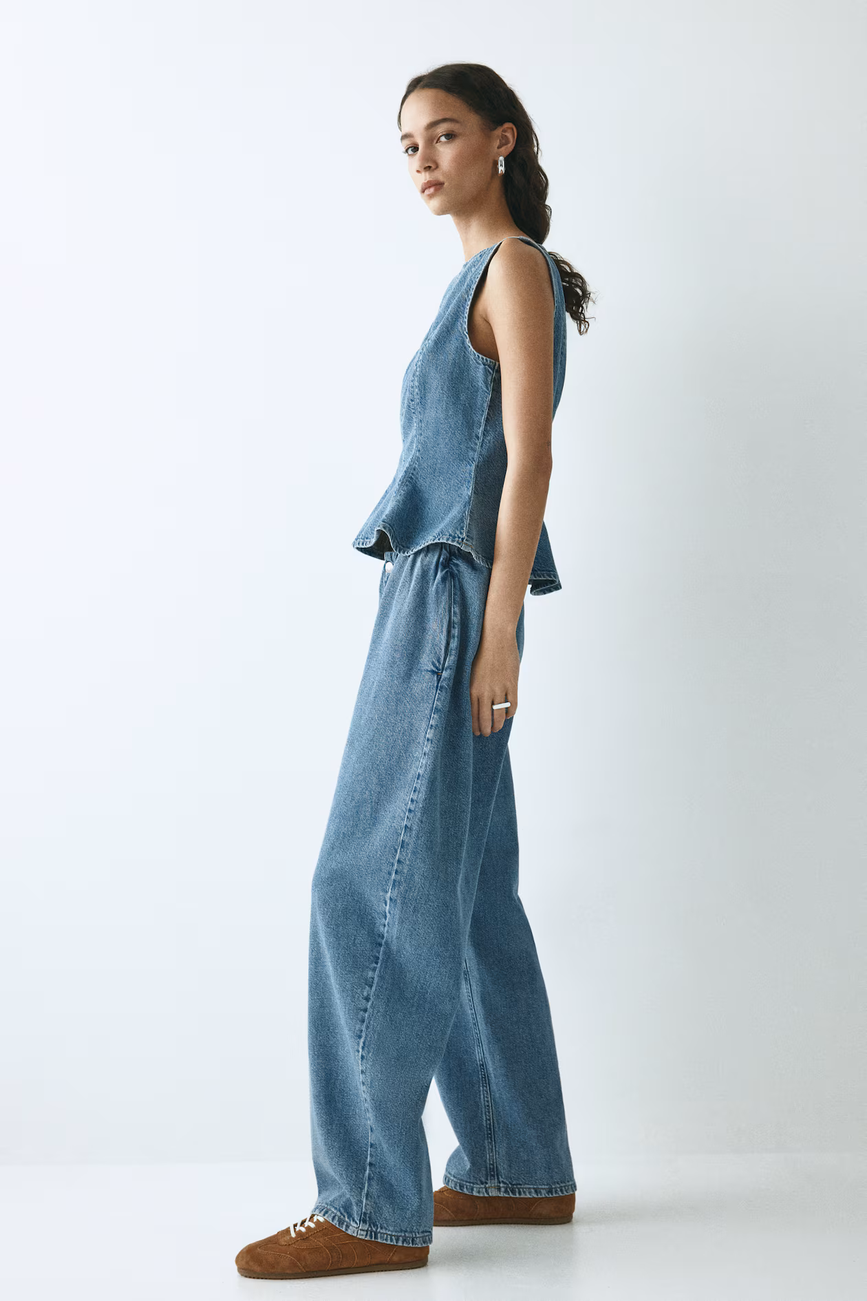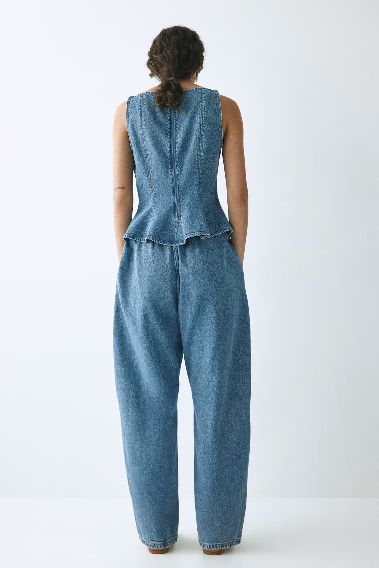 Oversized pants in rigid cotton denim that feels firm at first, softening and relaxing with wear. Covered elastic at waistband, zip fly with button, and discreet side pockets. Curved, voluminous legs with a regular fit from hip to thigh, tapering to hem.