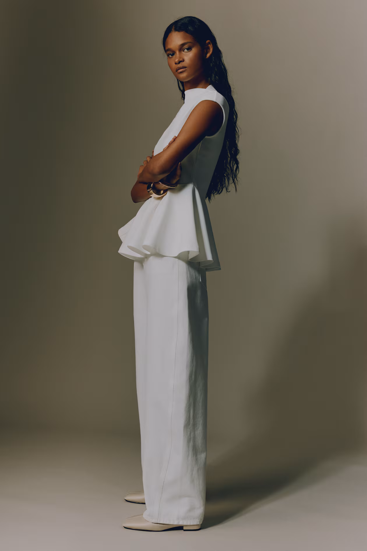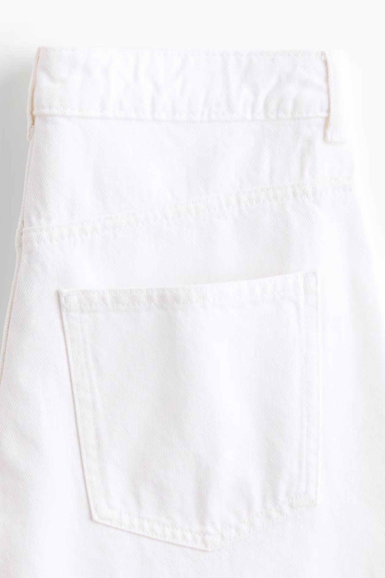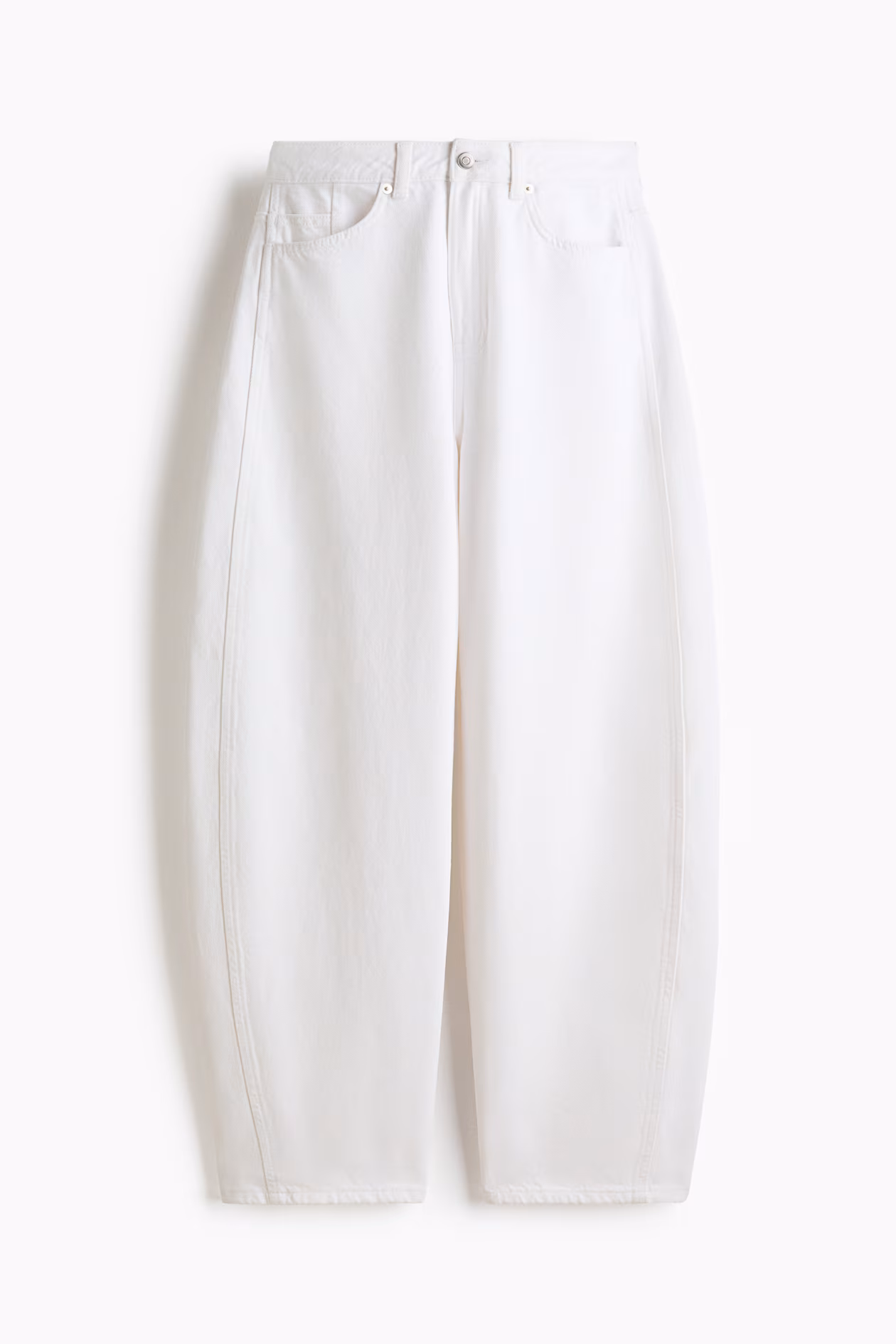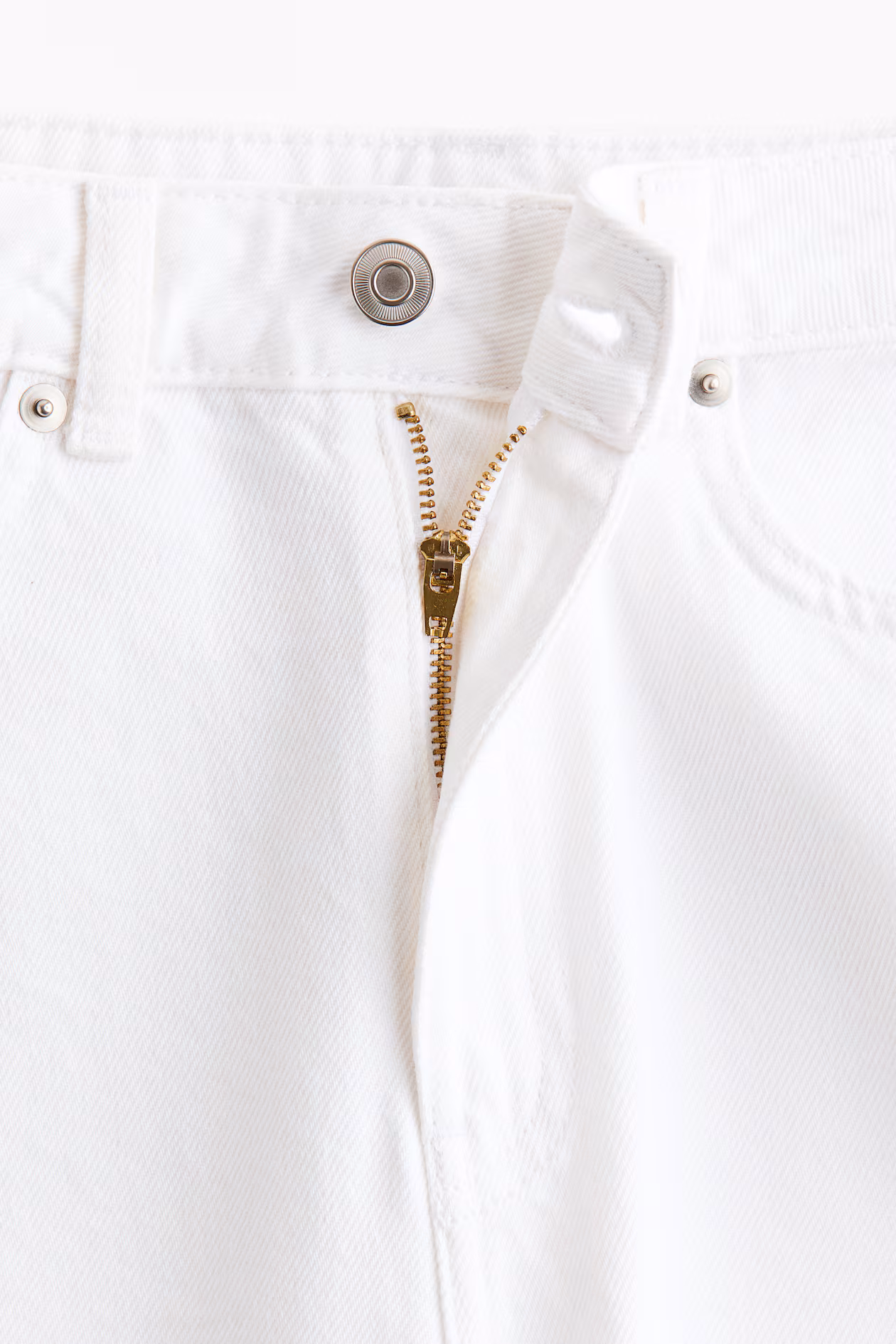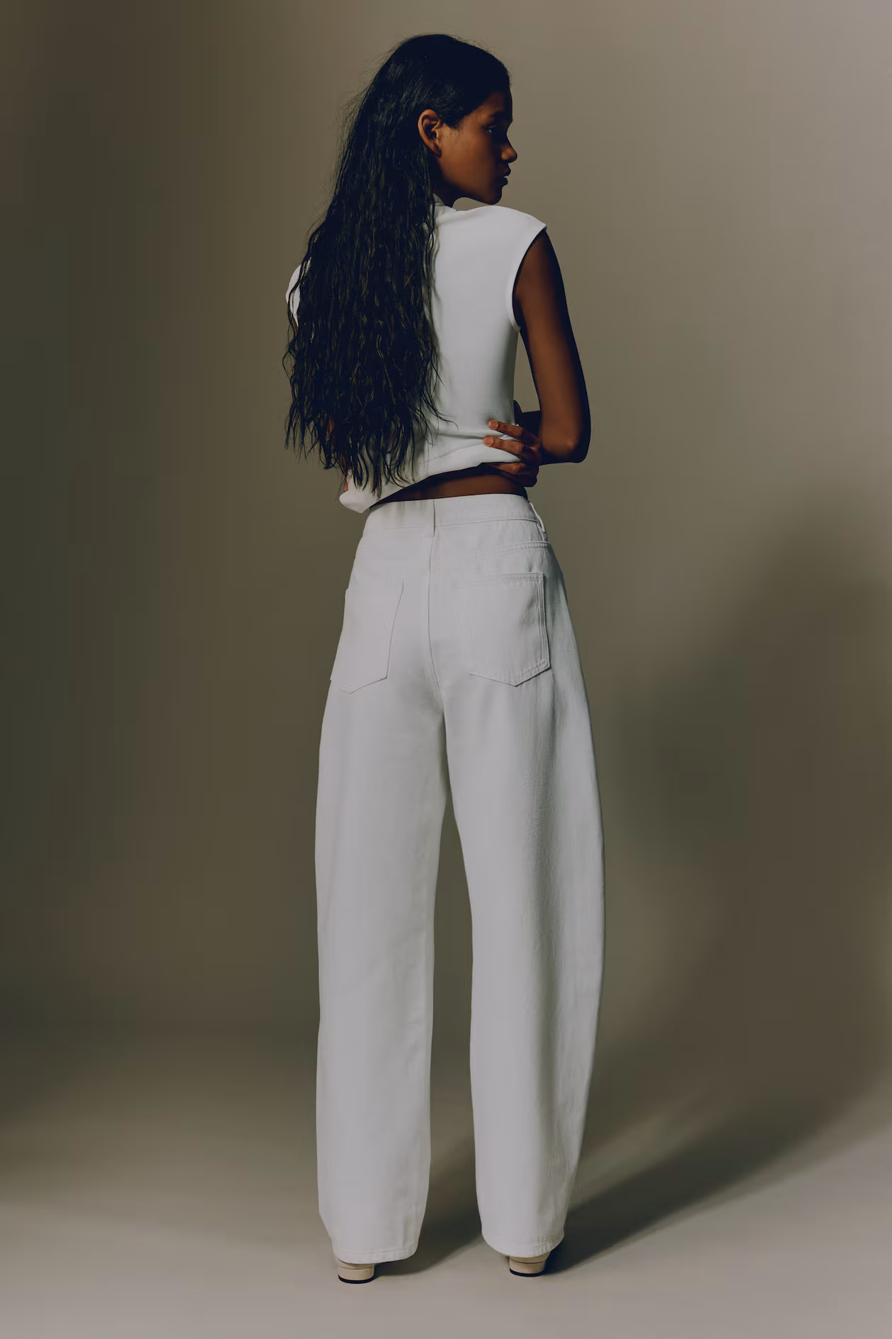 5-pocket jeans in rigid cotton denim that feels firm at first, softening and relaxing with wear. Regular fit from hip to thigh. High waist, zip fly with button, and voluminous, curved legs, tapered to hems. Regular length, designed to fall at top of foot with little or no stacking. Style with an oversized blazer for a modern look.