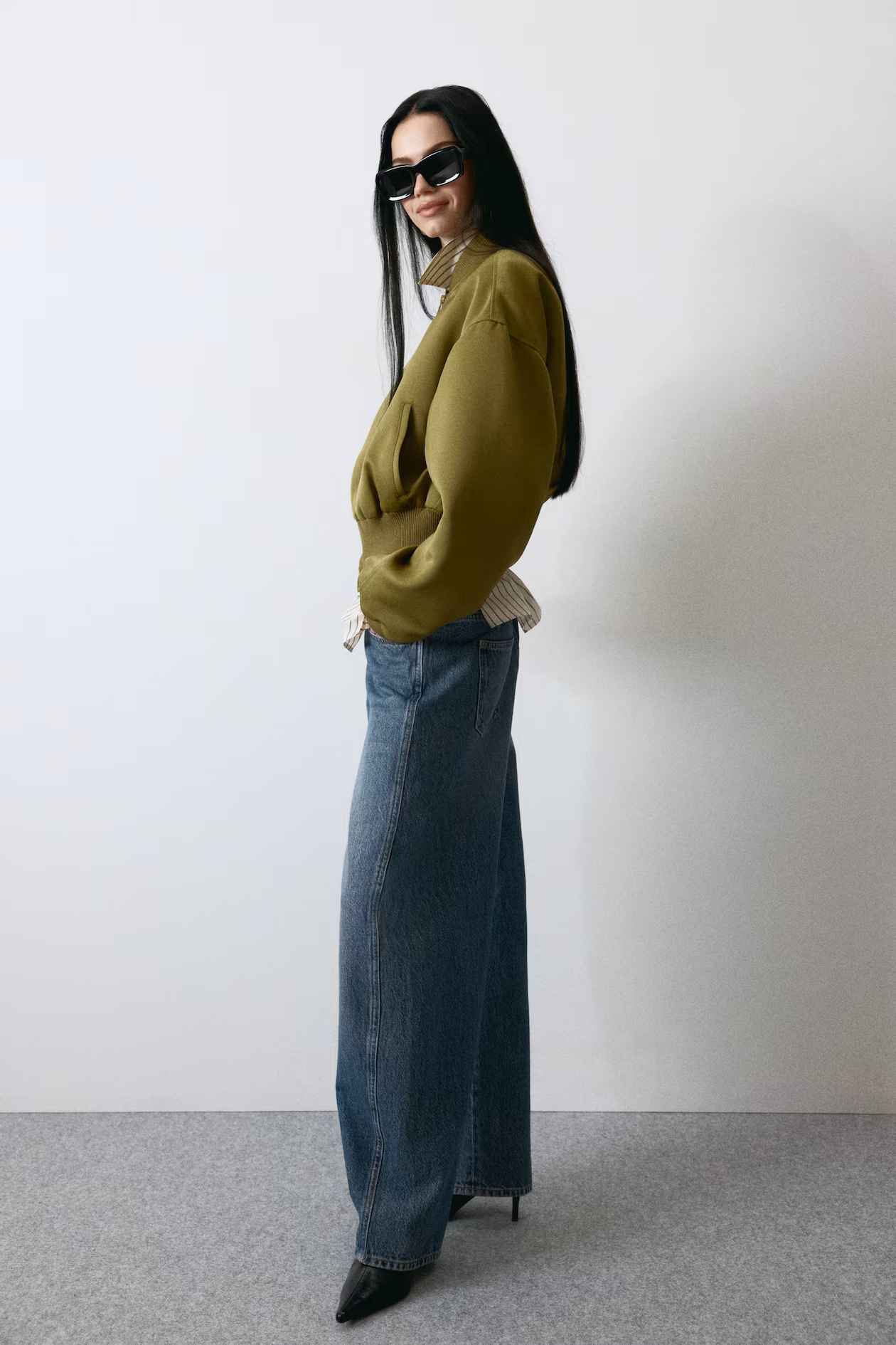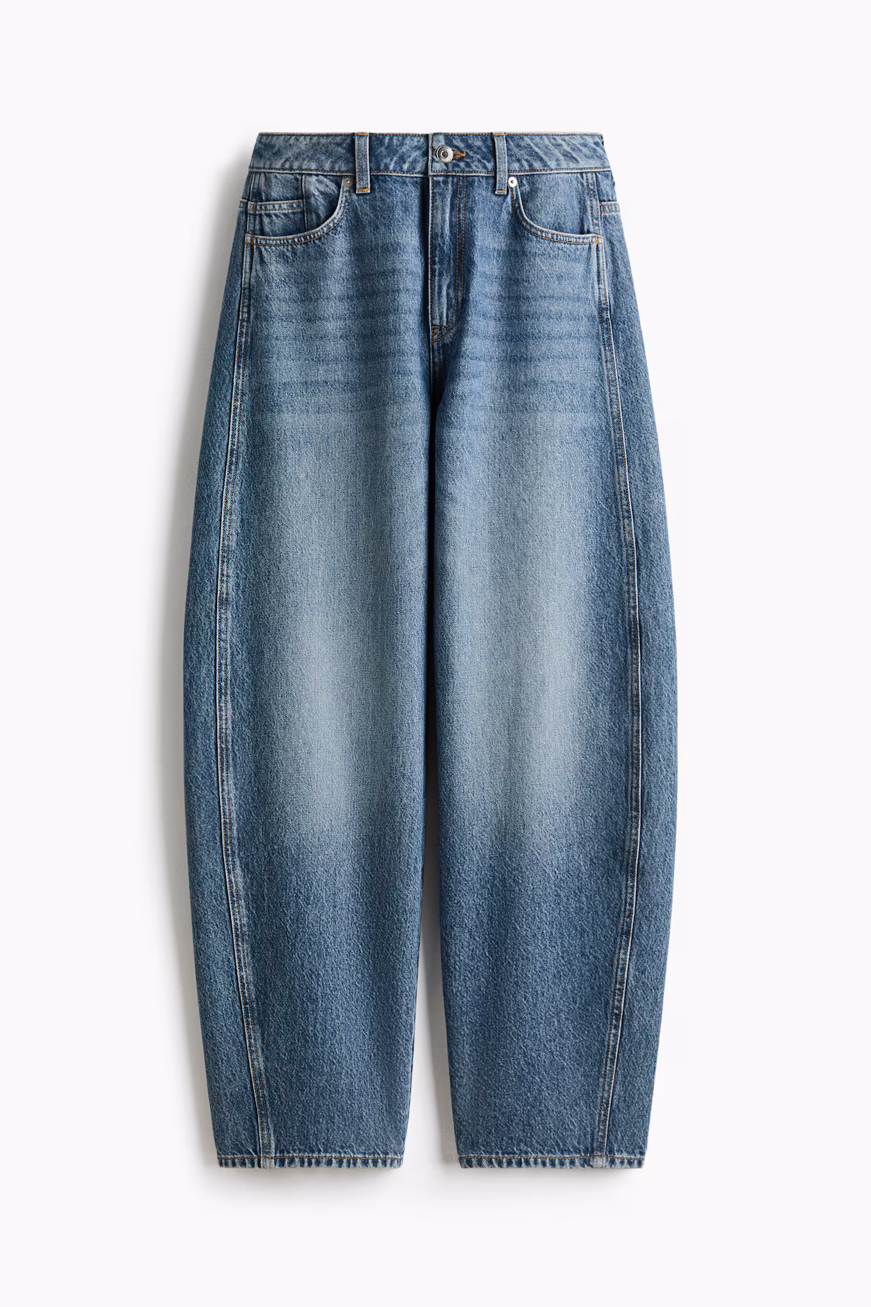 5-pocket jeans in rigid cotton denim that feels firm at first, softening and relaxing with wear. Regular fit from hip to thigh. High waist, zip fly with button, and voluminous, curved legs, tapered to hems. Regular length, designed to fall at top of foot with little or no stacking. Style with an oversized blazer for a modern look.
