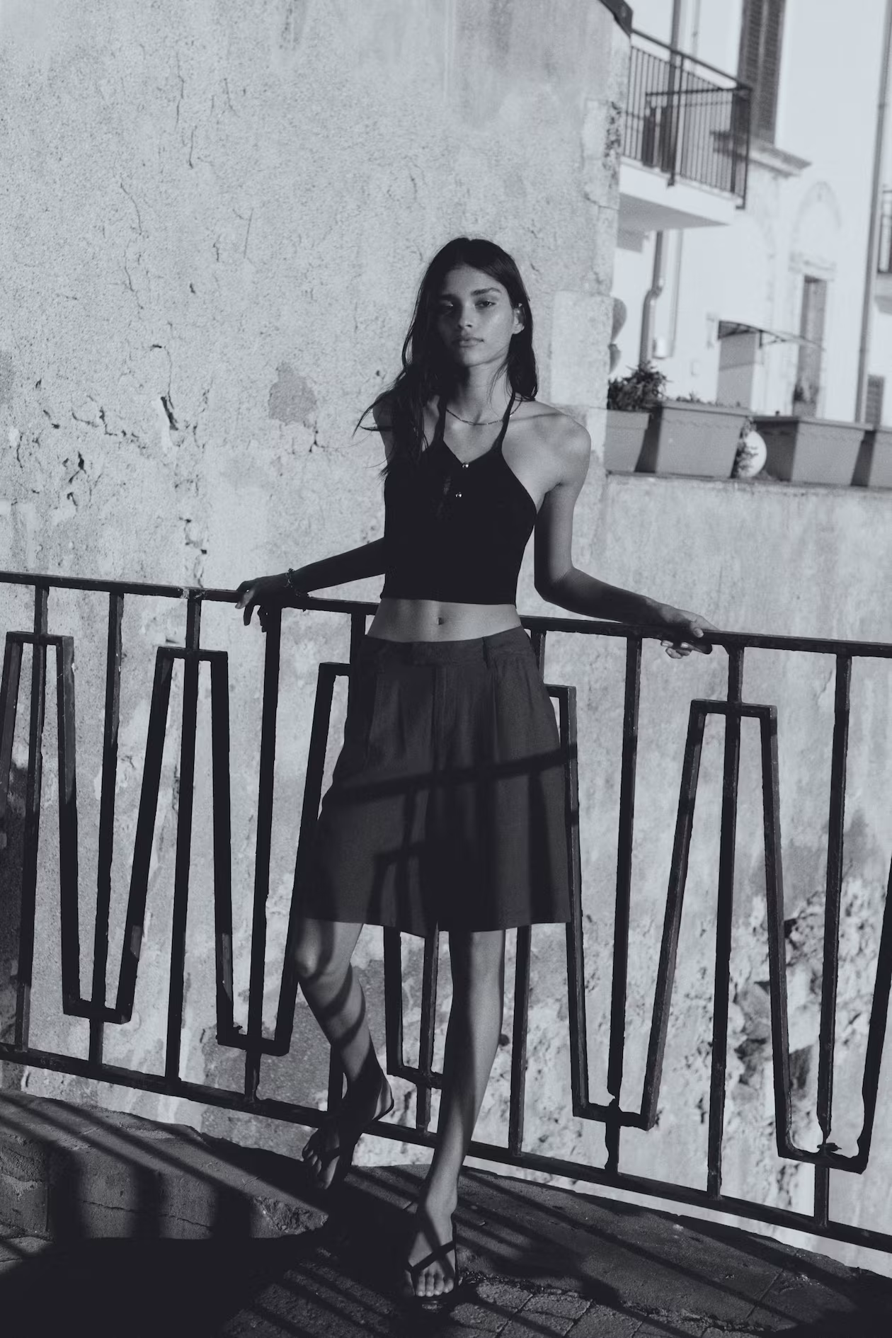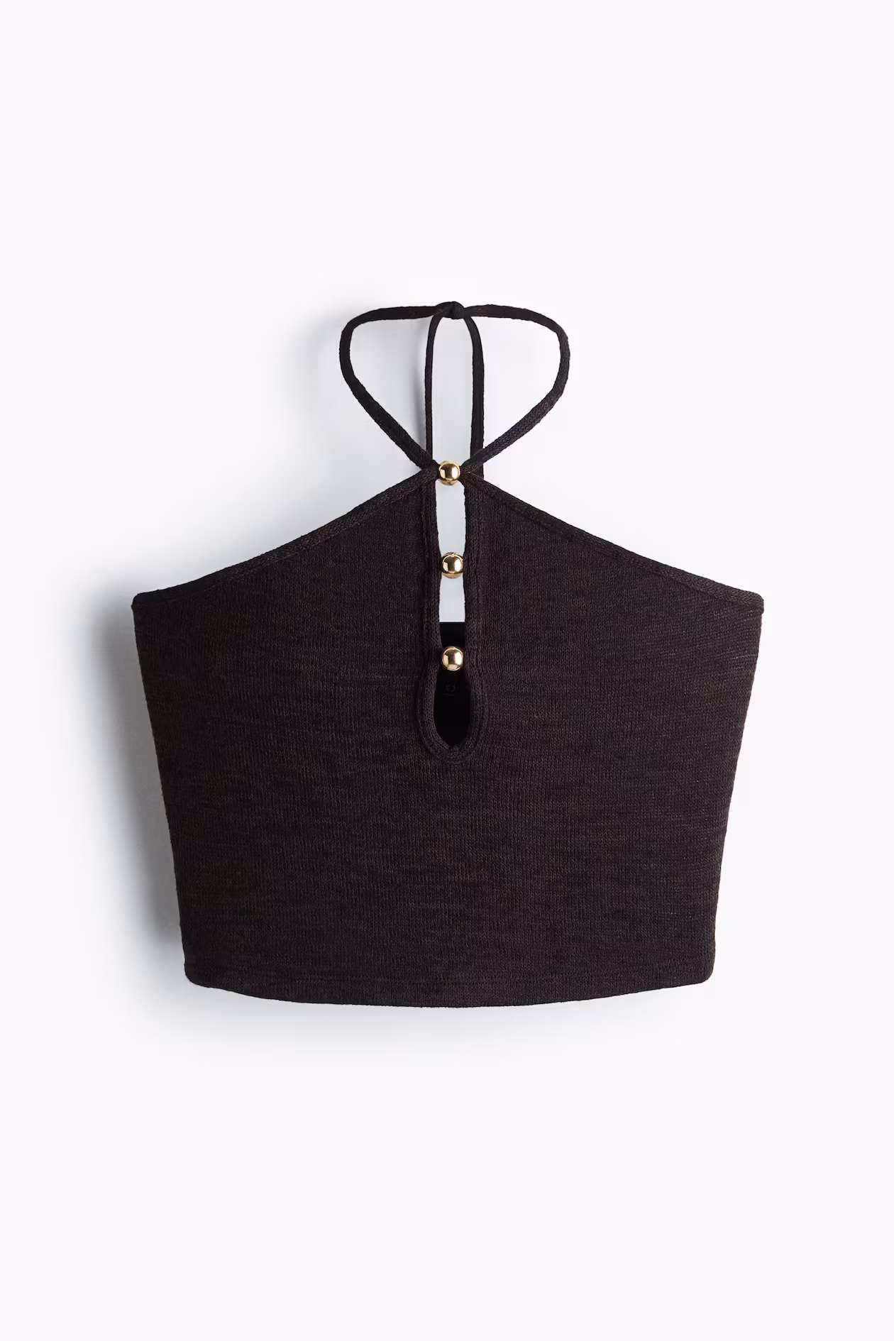 Fitted, fine-knit crop top with narrow halterneck ties. Low-cut opening at front with metallic beads.