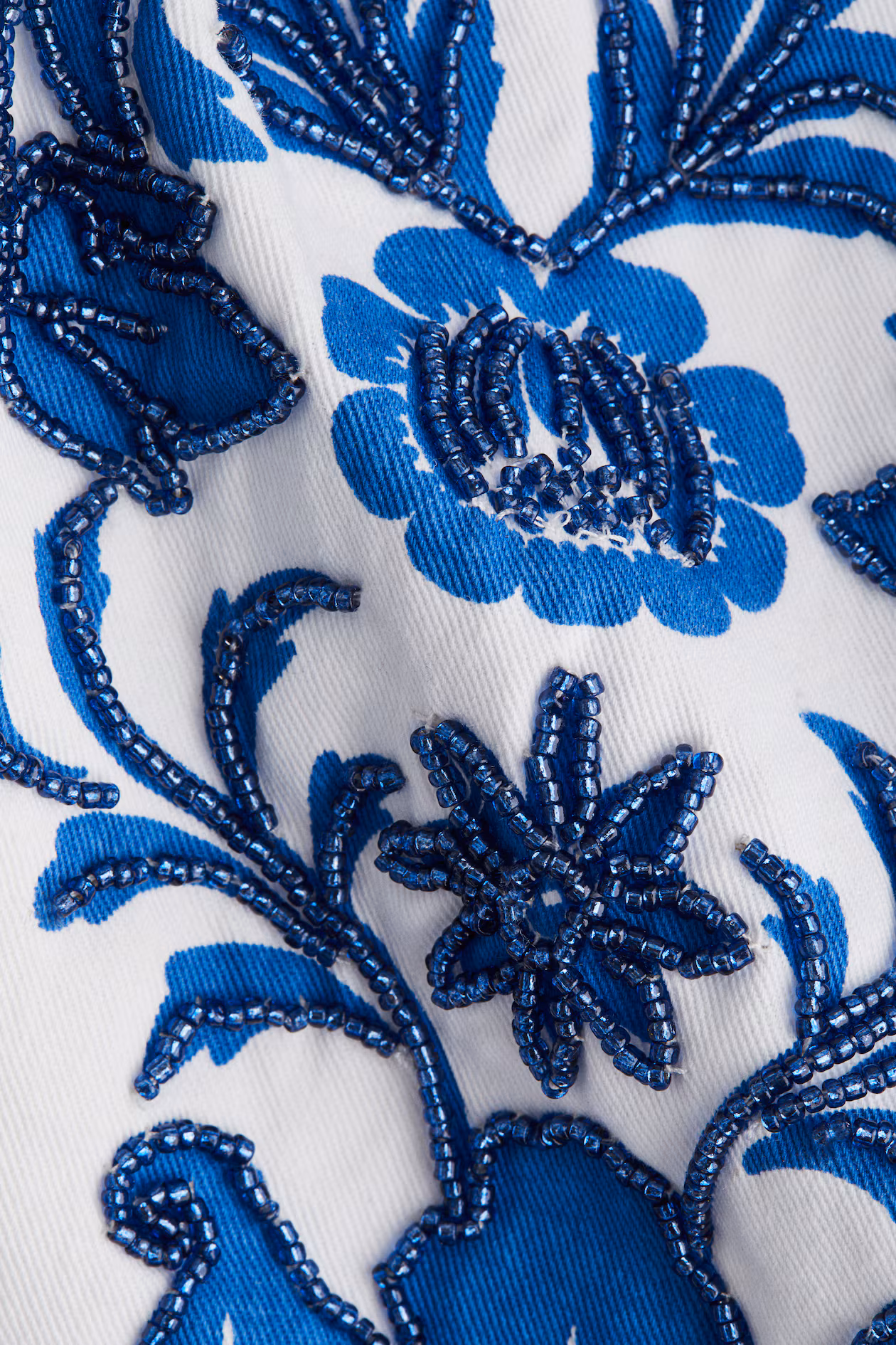Short, fitted top in cotton twill. Printed motif at front and sides embellished with small, tone-on-tone beads. Narrow, adjustable shoulder straps, straight neckline, and a concealed zipper at one side.
