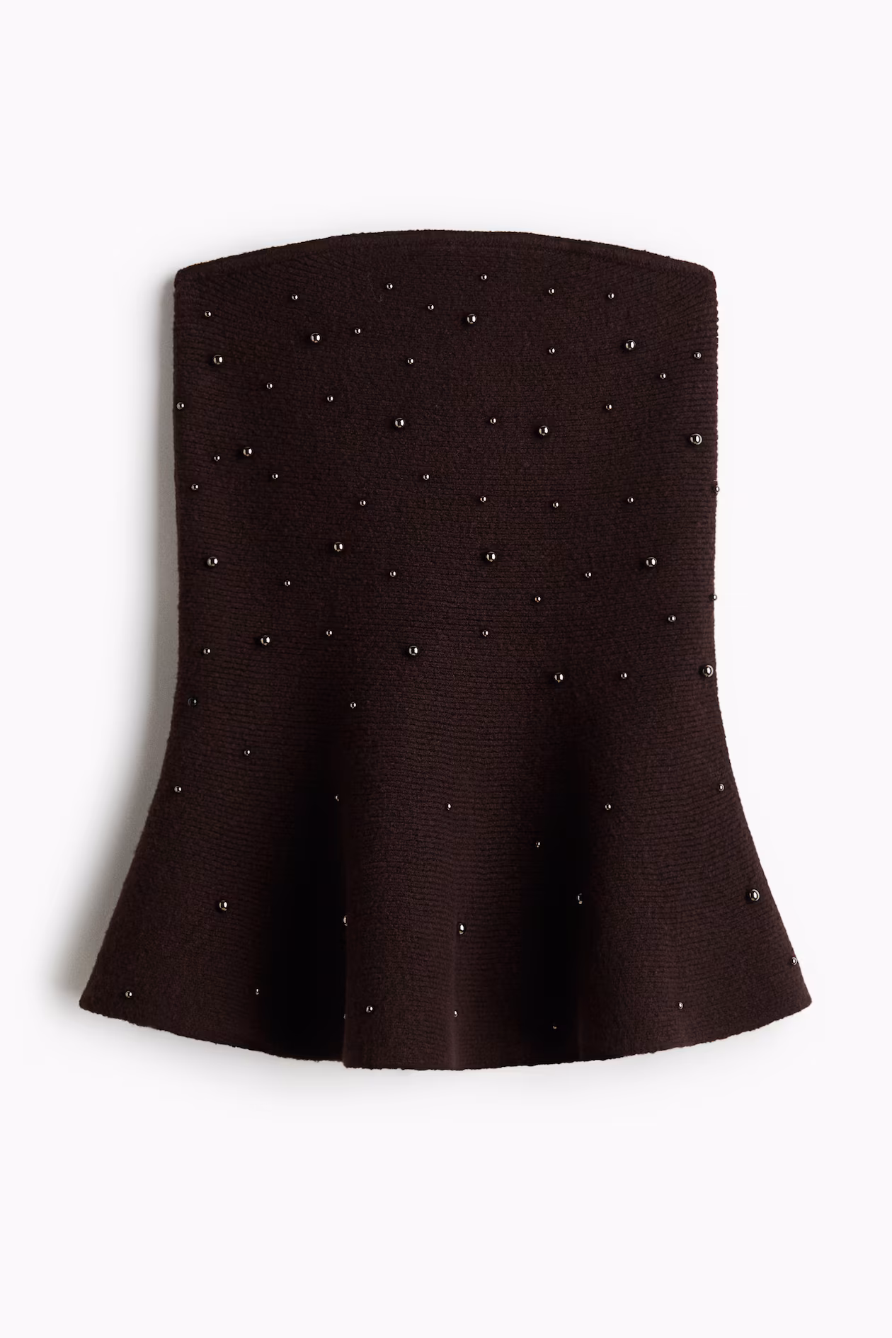 Fitted bandeau top in a soft knit embellished with different sizes of beads. Silicone trim inside upper edge. Flared peplum for a flattering silhouette.