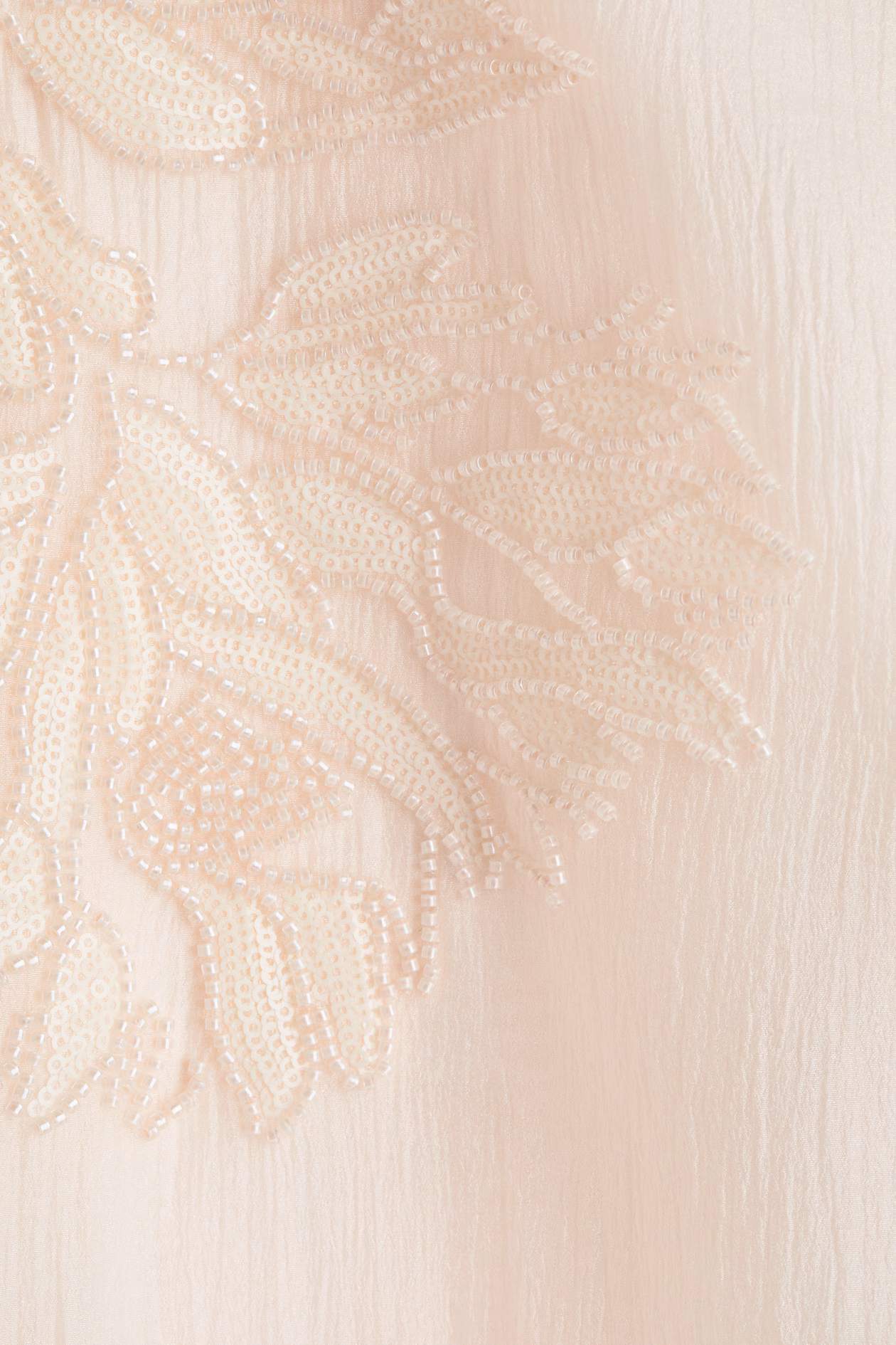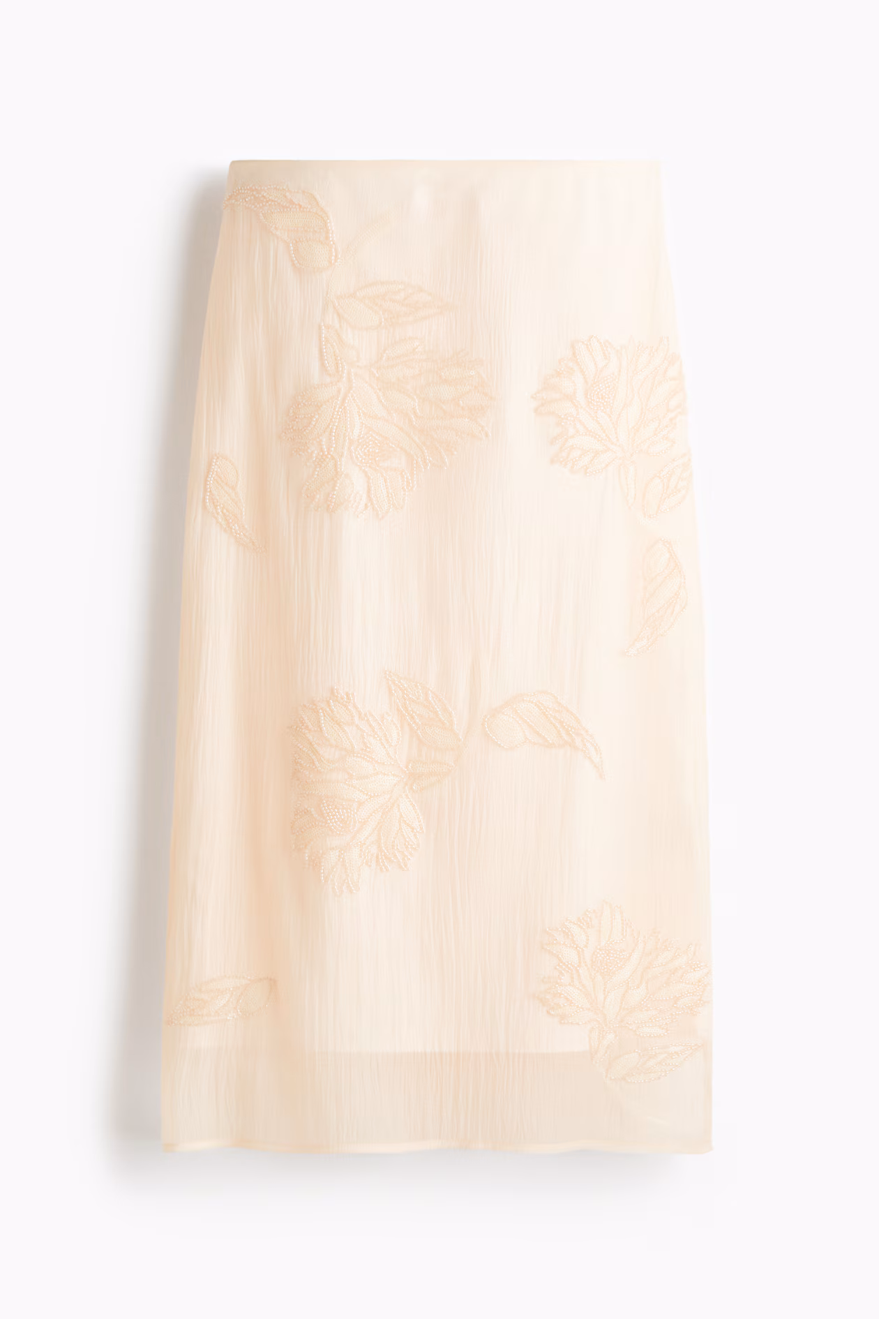 Fitted, calf-length skirt in a sheer, woven, crinkled fabric with embroidered motifs at front embellished with sequins and small glass beads. High waist, concealed zipper at back, and straight-cut hem with a slit at back. Lined.