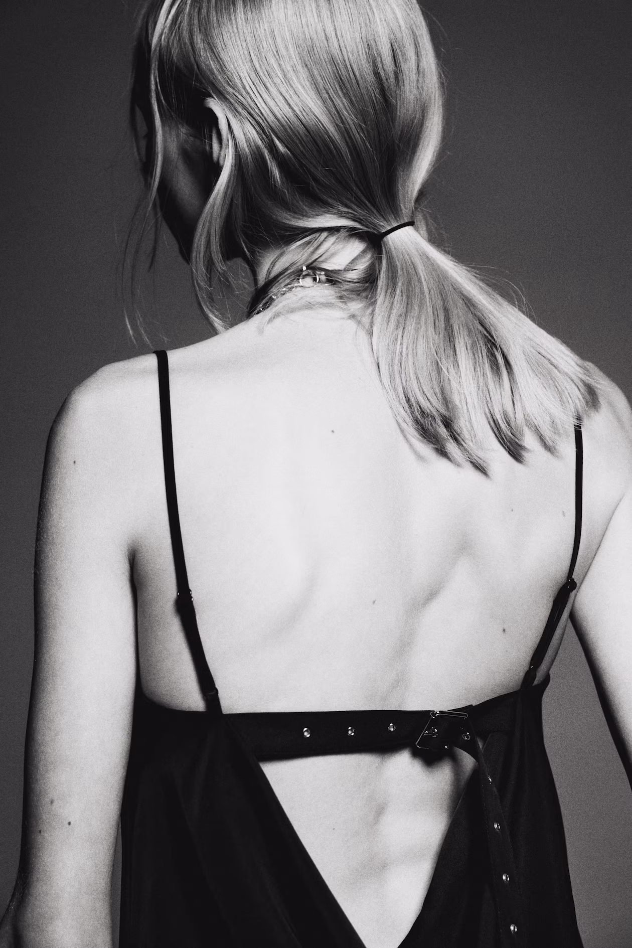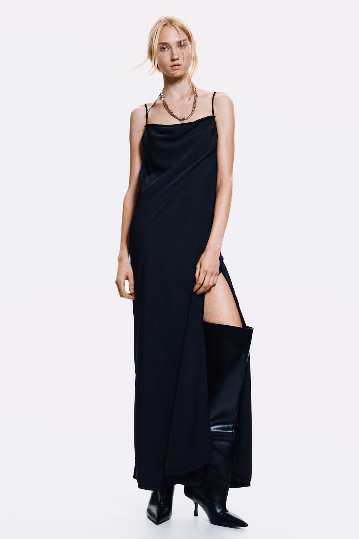 Ankle-length dress in twill. Adjustable, extra-narrow shoulder straps, straight neckline at front, and an adjustable eyelet belt above a draped, low-cut neckline at back. Unlined.