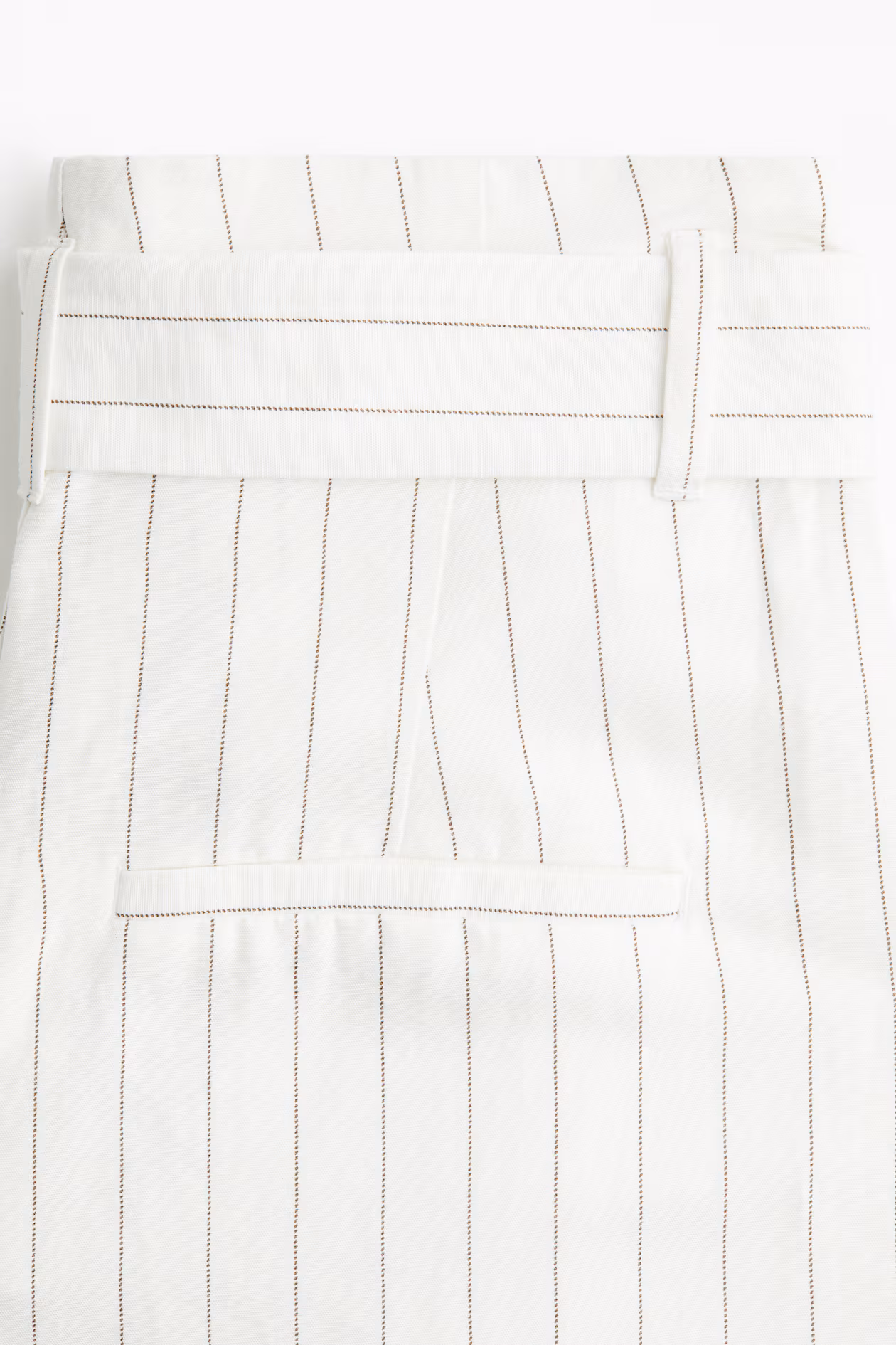 Tailored trousers in woven fabric made from a linen blend. High waist featuring a detachable belt with a rectangular buckle and a zip fly with a concealed hook-and-bar fastener. Diagonal side pockets, fake welt pockets at the back and wide legs with pleats at the front and creases down the front and back.