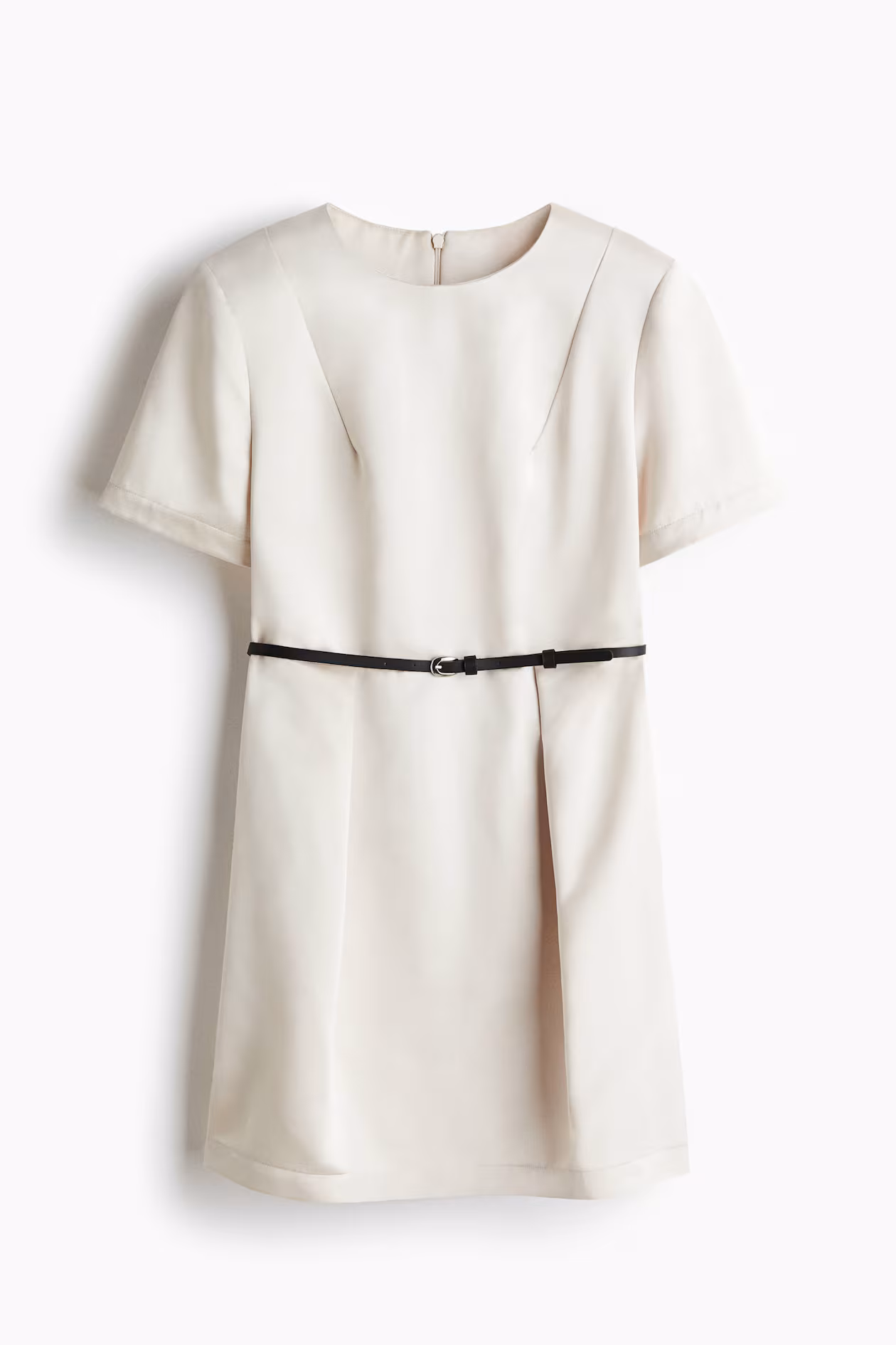 Short dress in woven fabric with a slight sheen. Round neckline, concealed zipper at back, and a removable belt for a tapered silhouette. Darts at front and back of shoulders, pleats at front and back of waist, shoulder pads, and short sleeves.