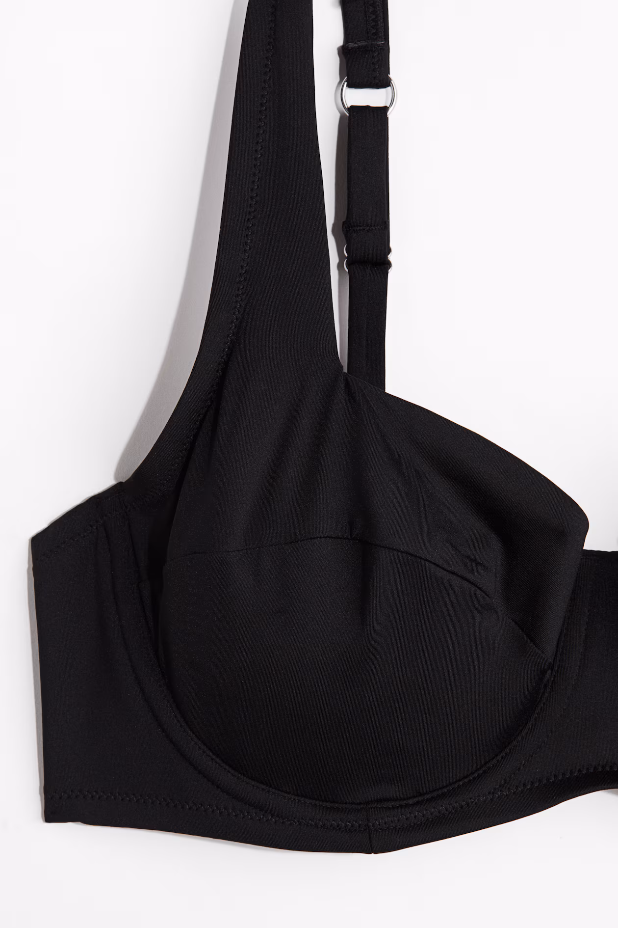 Lined bikini top. Adjustable shoulder straps, underwire cups for natural shape and light support, and adjustable hook fastening at back.