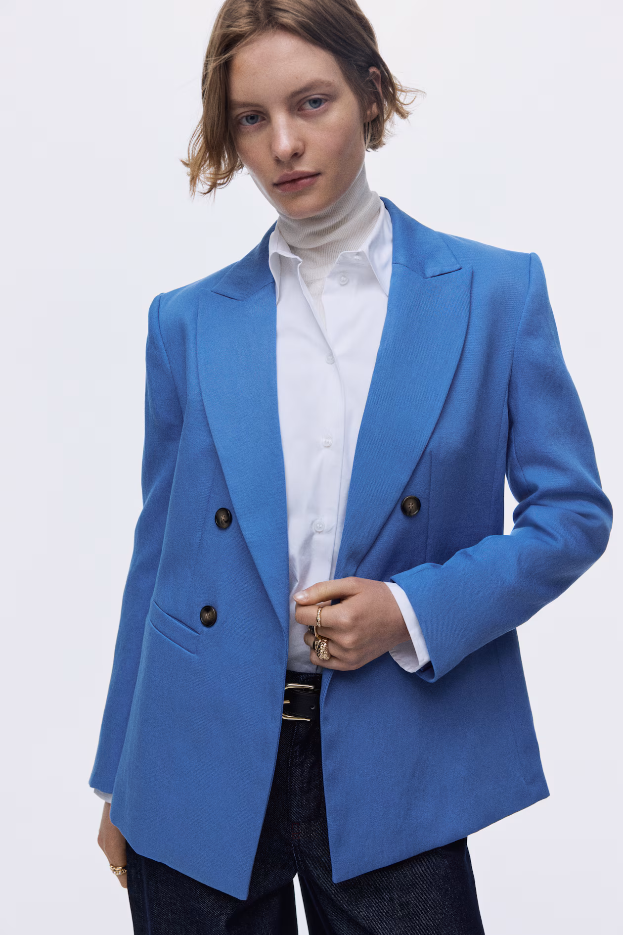 Double-breasted blazer in woven fabric. Pointed lapels, decorative buttons at front, and welt front pockets. Shoulder pads, long sleeves, and stacked buttons at cuffs. Lined.
