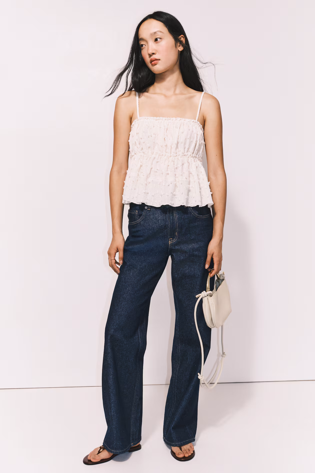 5-pocket jeans in washed cotton denim. High waist, zip fly and button and straight, wide legs.