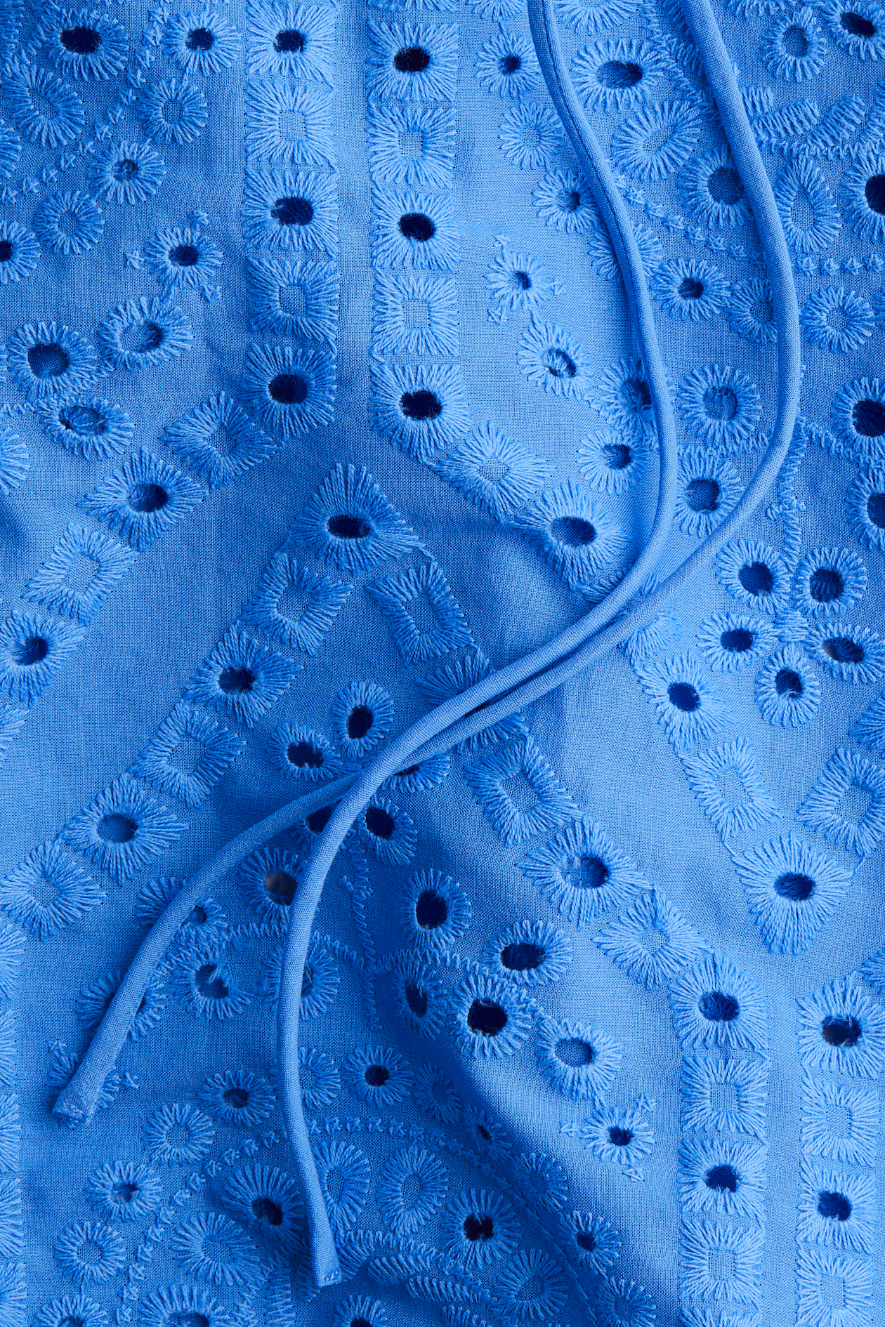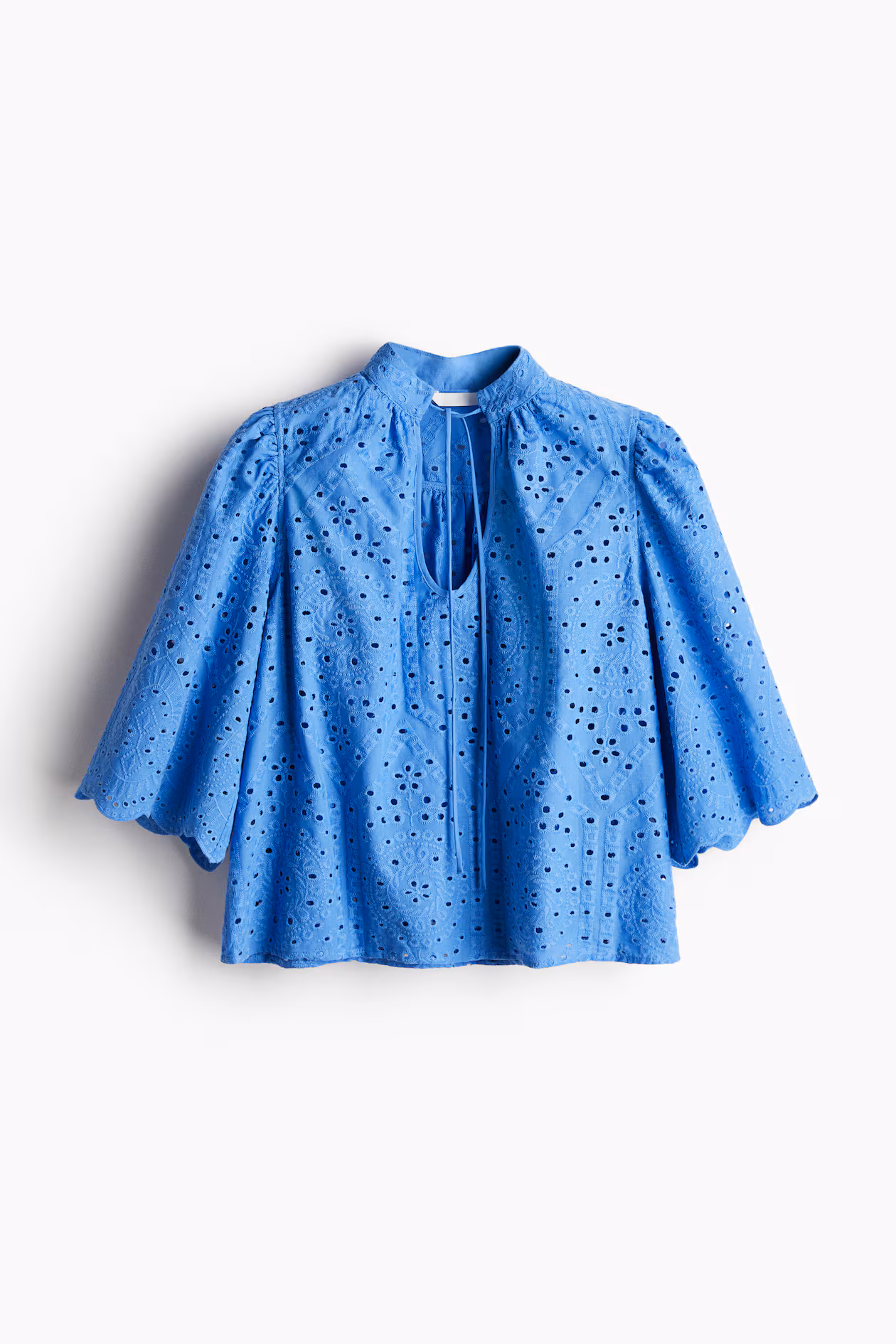 Loose-fit blouse in airy, eyelet-embroidered woven cotton. Band collar, V-shaped opening at front with extra-narrow ties, and a yoke at back with gathers. Gathers on shoulders, elbow-length sleeves, and scalloped cuffs.