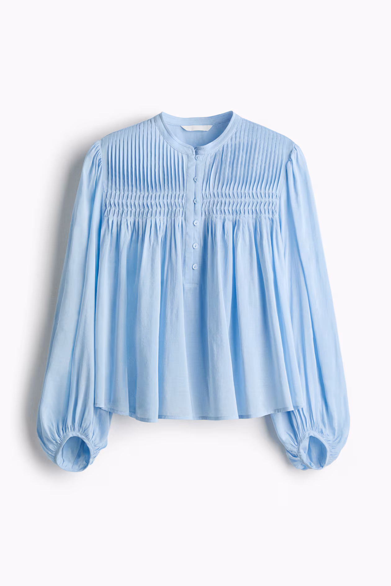 Loose-fit blouse in a woven viscose and cotton blend. Band collar, buttons at front, and long balloon sleeves. Yoke with pintucks at front and gathers at back.