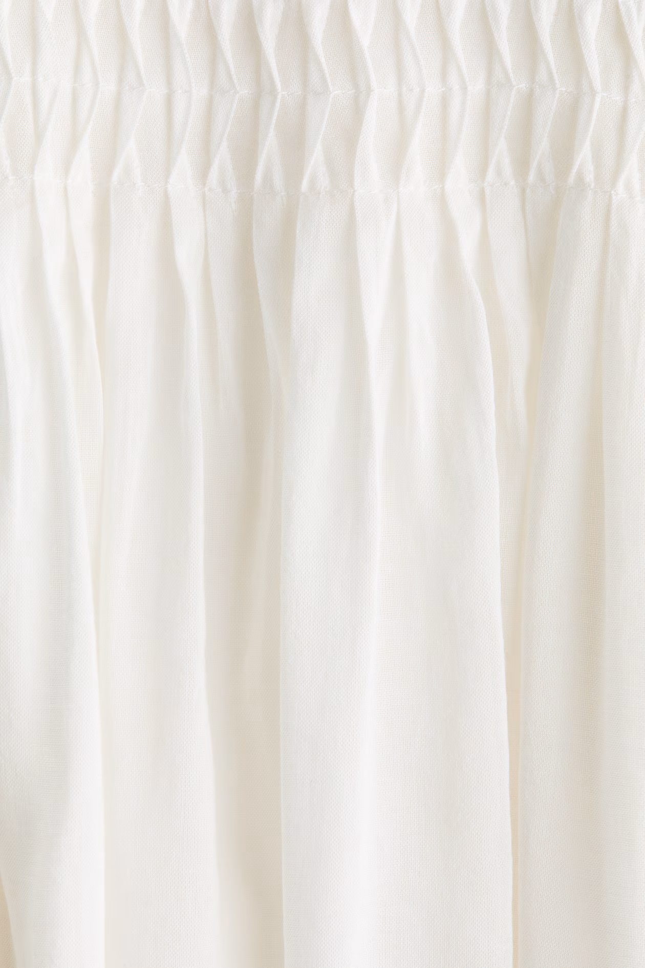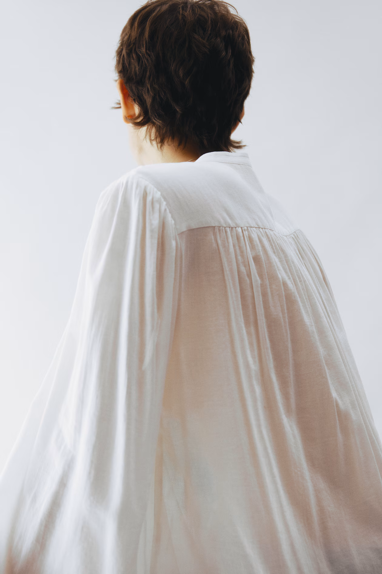 Loose-fit blouse in a woven viscose and cotton blend. Band collar, buttons at front, and long balloon sleeves. Yoke with pintucks at front and gathers at back.
