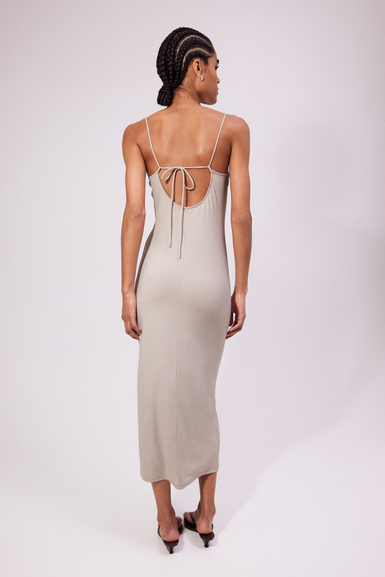 Fitted, calf-length dress in soft jersey. Extra-narrow shoulder straps that thread through small loops and tie at back. Round, low-cut neckline at front and a low-cut back.