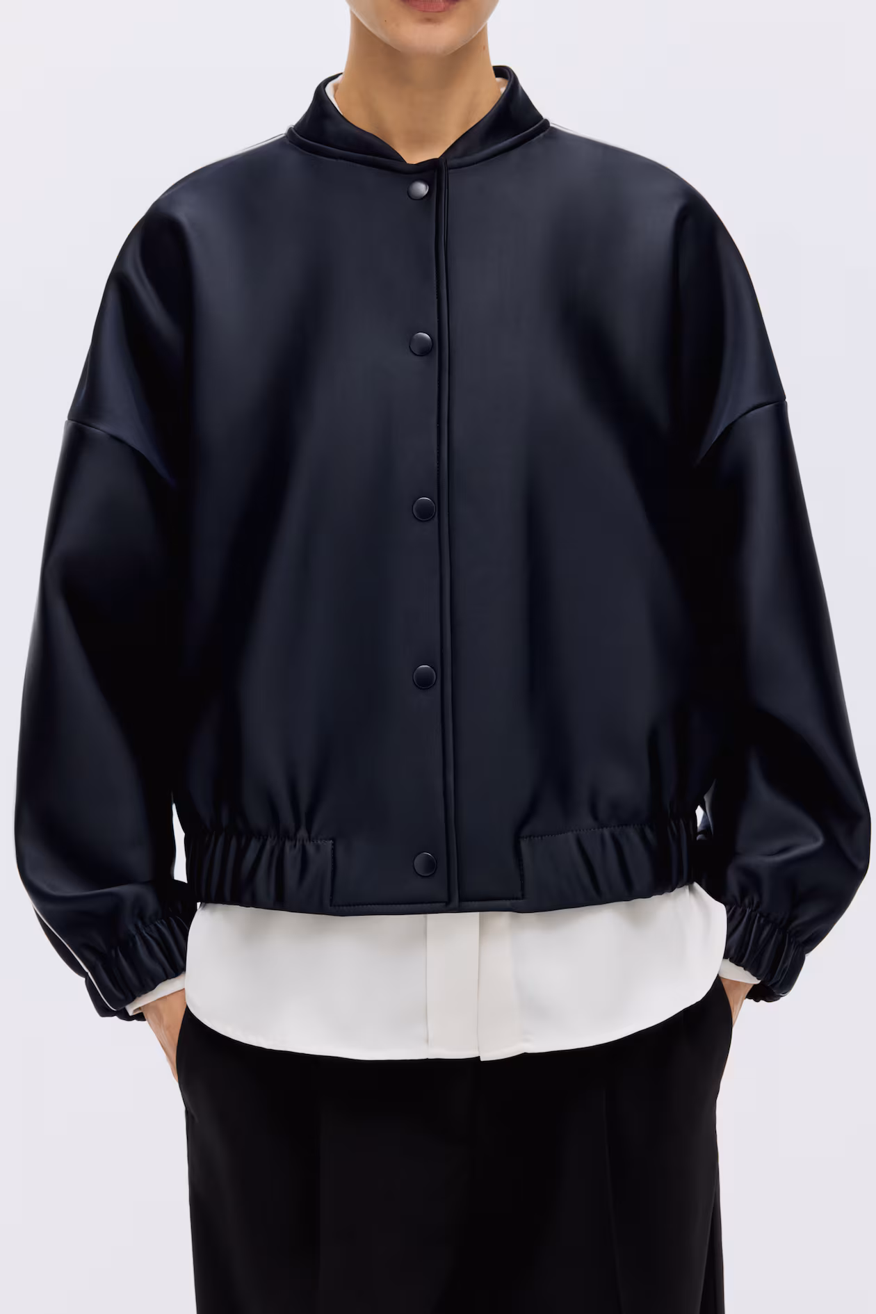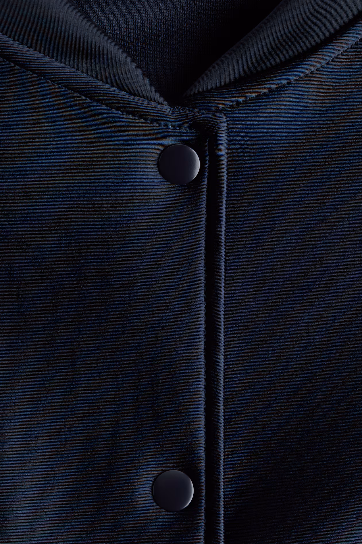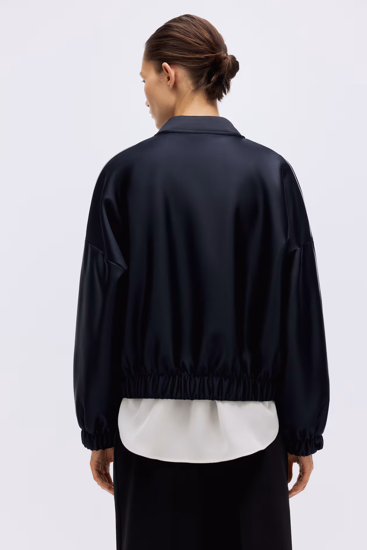 Relaxed-fit bomber jacket in thick jersey with a slight sheen. Stand-up collar, snap fasteners at front, heavily dropped shoulders, and long sleeves with accent-color piping. Covered elastic at cuffs and hem. Lined.