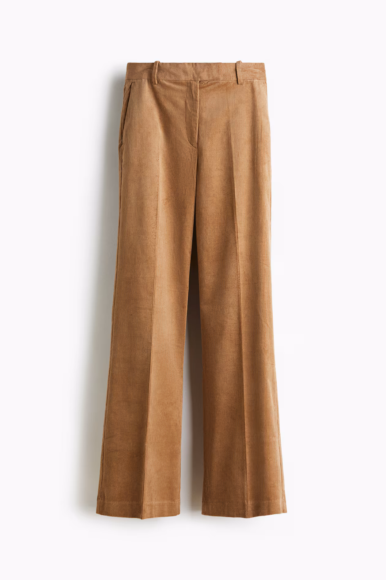 Pants in soft cotton corduroy. High waist, extended waistband tab with hook-and-bar fasteners, and zip fly with concealed button. Diagonal side pockets, welt back pockets, and bootcut legs with creases at front and back.