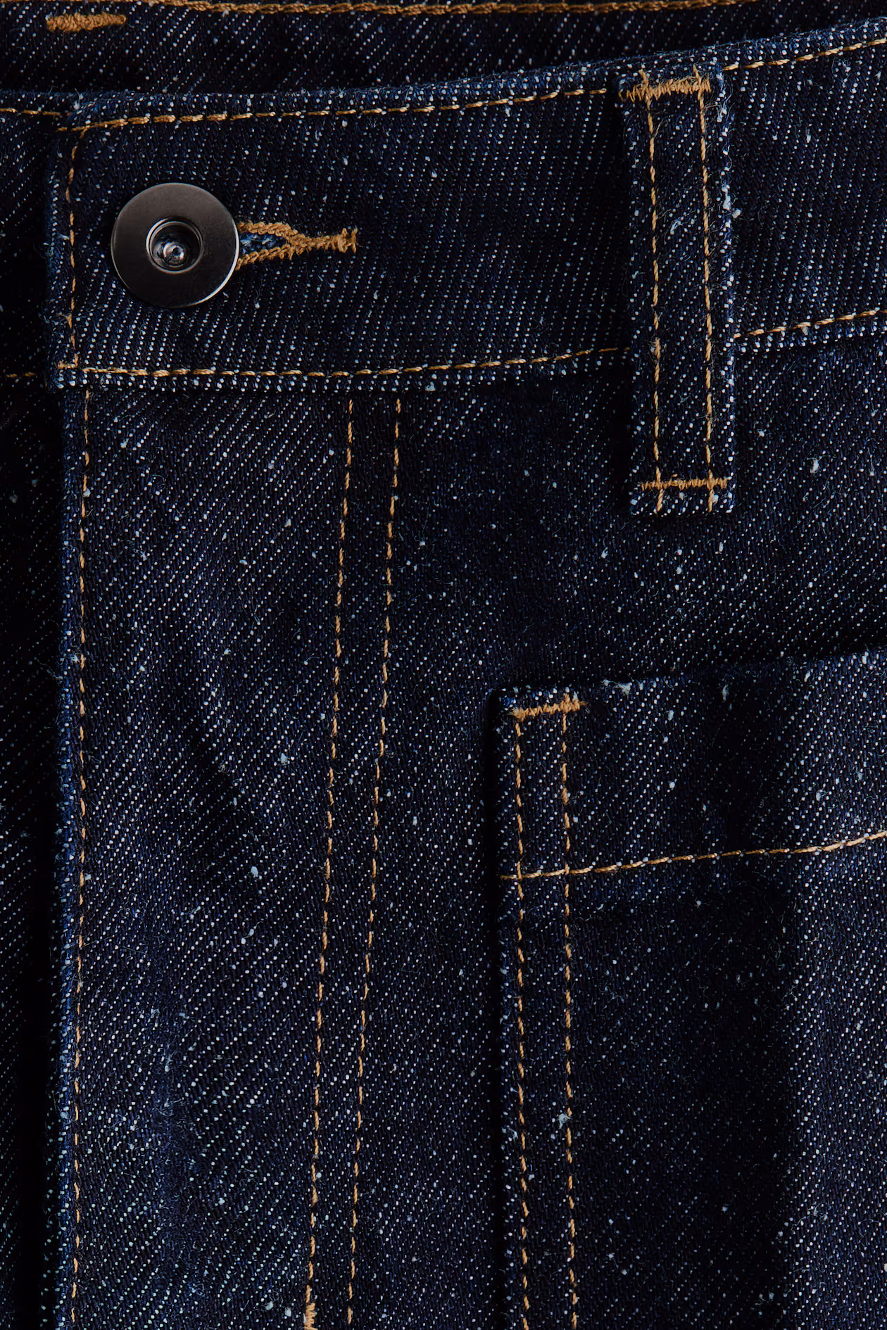 Bootcut jeans in rigid, nepped cotton denim that feels firm at first, softening and relaxing with wear. Slim fit from waist to thigh and flared from knee to hem. High waist, zip fly with button, patch front pockets, and patch back pockets. Creases at front and back. Longer length, designed to fall over foot with a stacking effect. A fashion icon from the 70s to now.