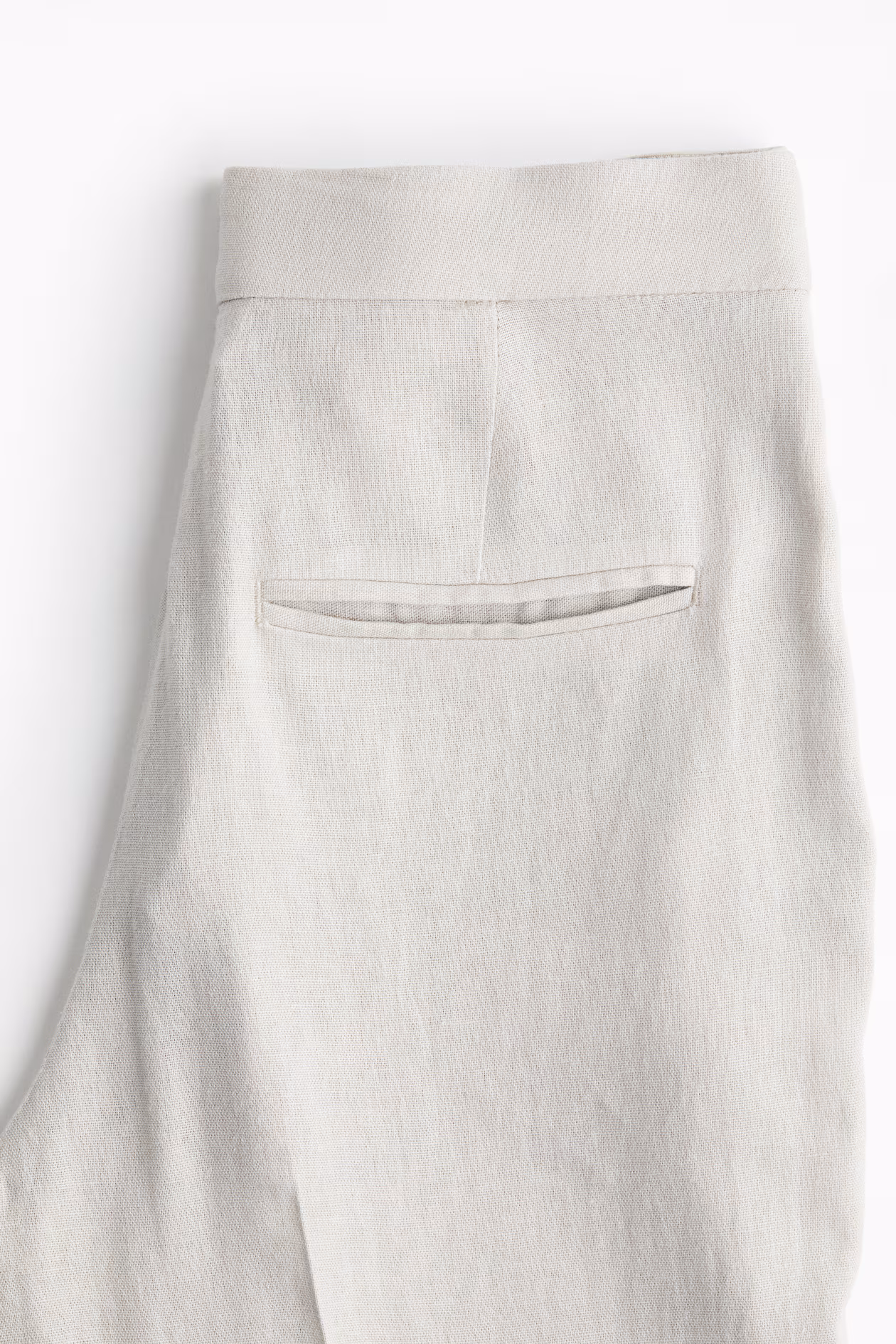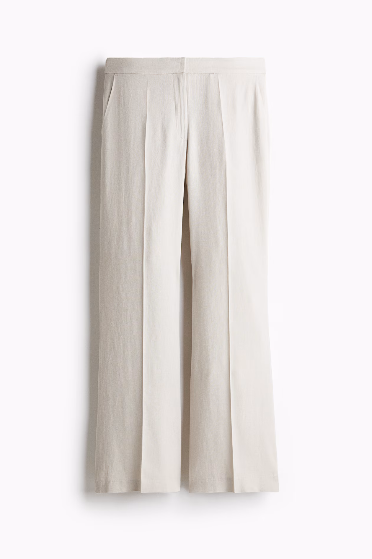 Pants in an airy, woven linen and viscose blend. High waist, waistband with concealed elastic, concealed button and hook-and-bar fasteners, and zip fly. Diagonal side pockets, mock back pockets, and bootcut legs with creases at front and back.
