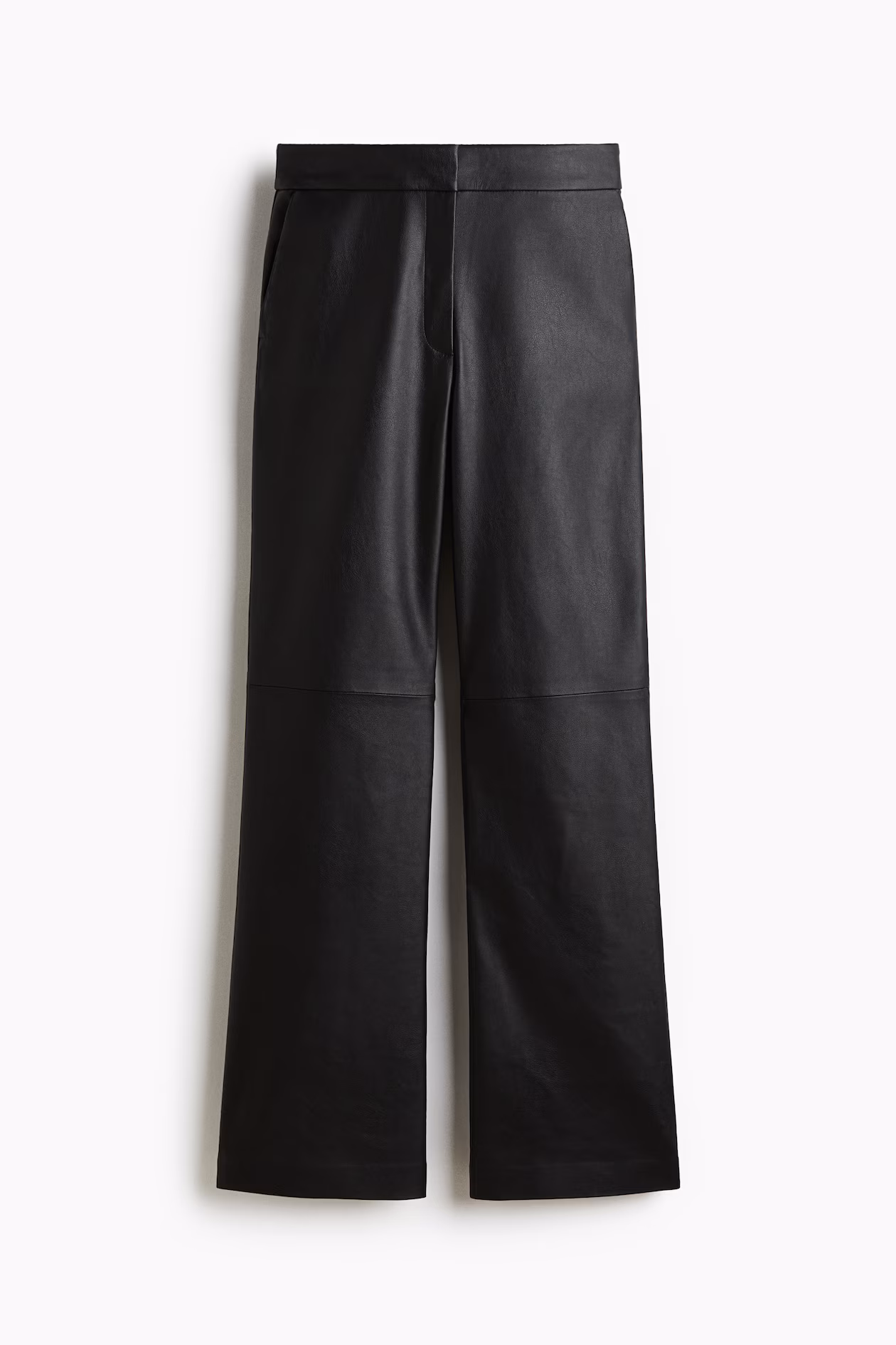 Pants with visible seam above knees. Zip fly with concealed button and hook-and-bar fasteners, diagonal side pockets, and mock welt back pocket. Bootcut legs.