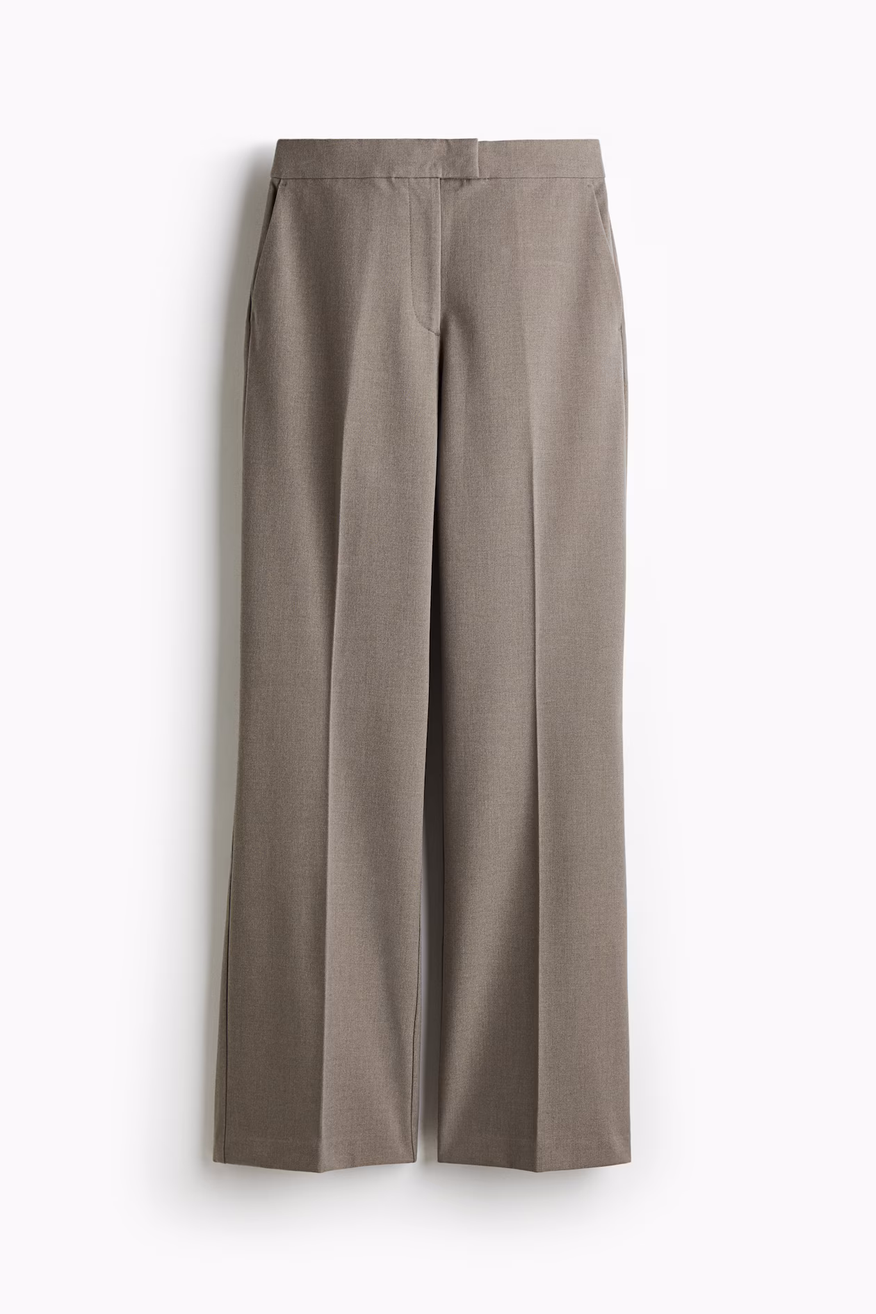 Pants in woven fabric. Extended waistband tab with hook-and-bar fasteners and zip fly with concealed button. Diagonal side pockets, welt back pockets, and bootcut legs with creases at front and back.
