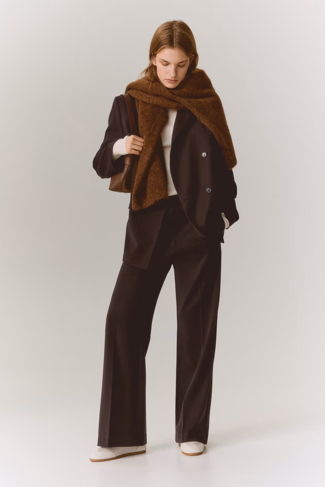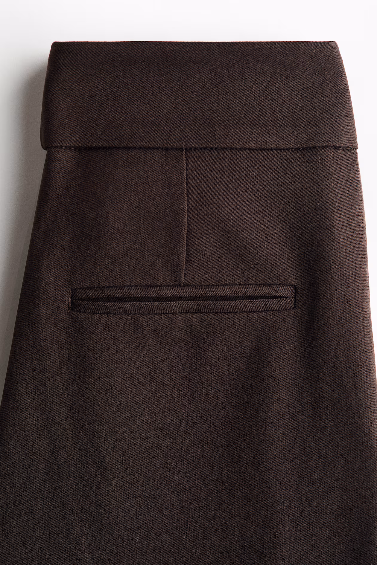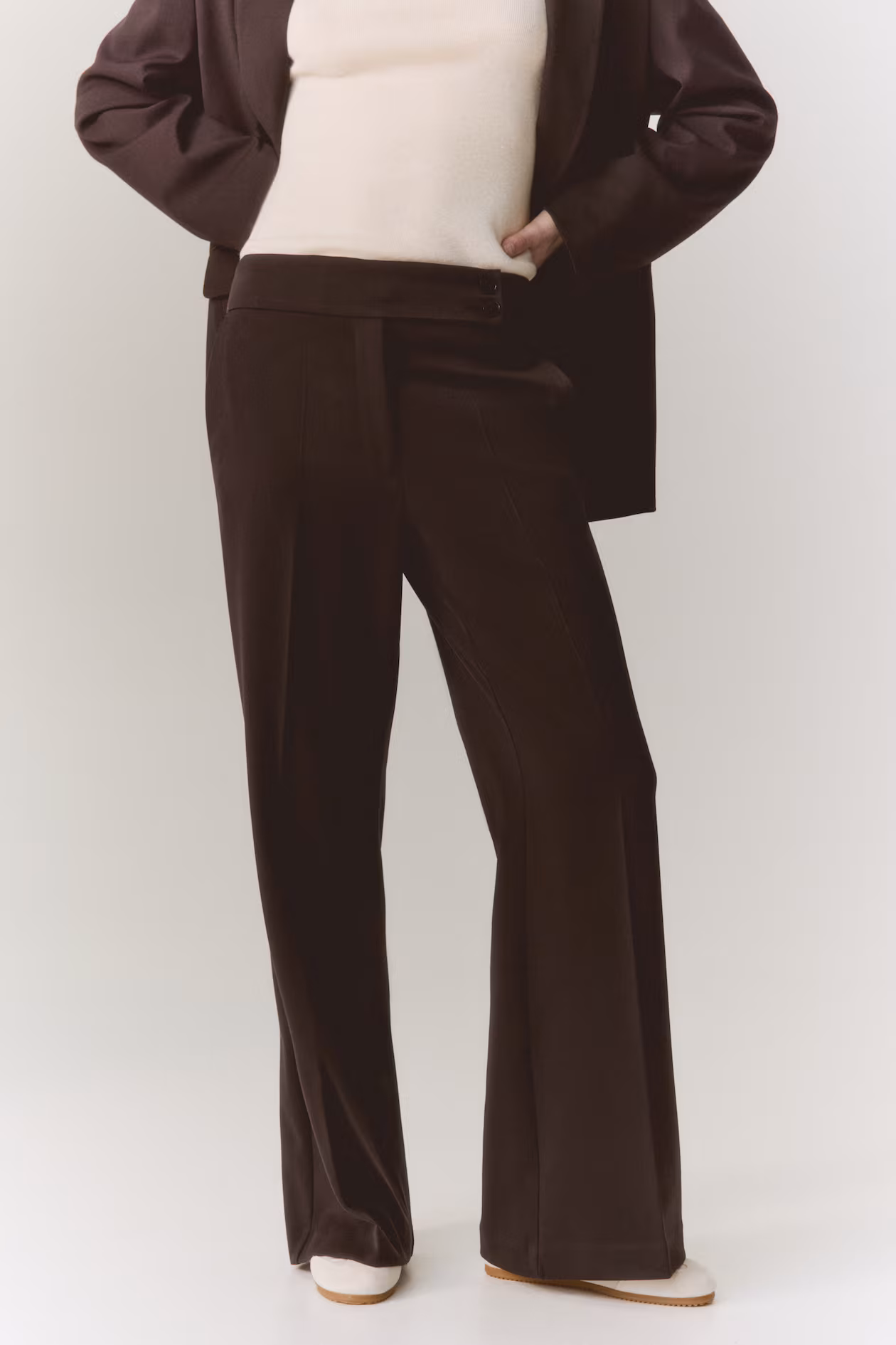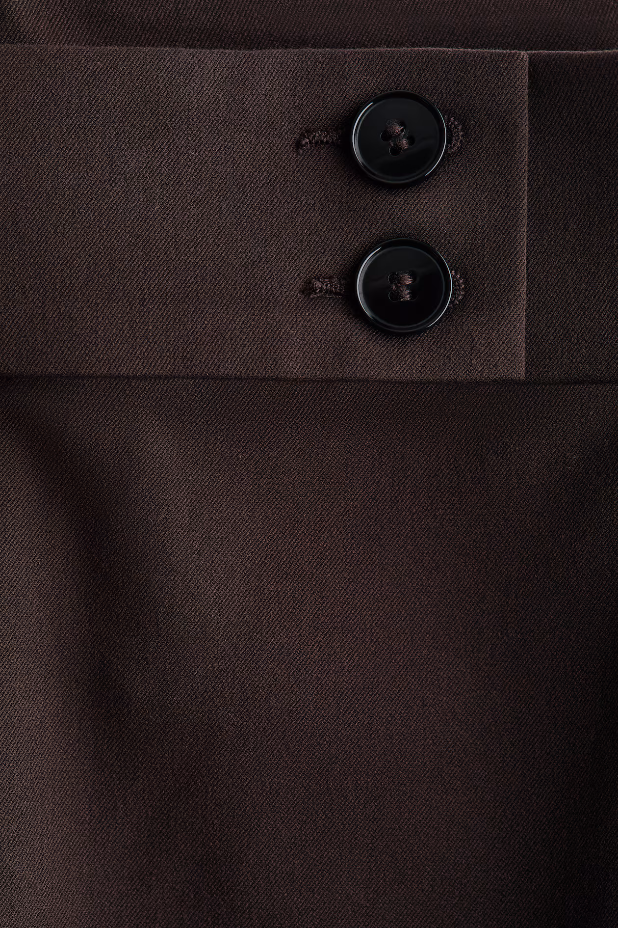 Fitted pants in twill. High waist, extended waistband tab with buttons and a concealed hook-and-bar fastener, and zip fly. Side pockets, a welt back pocket, and bootcut legs with creases at front and back.