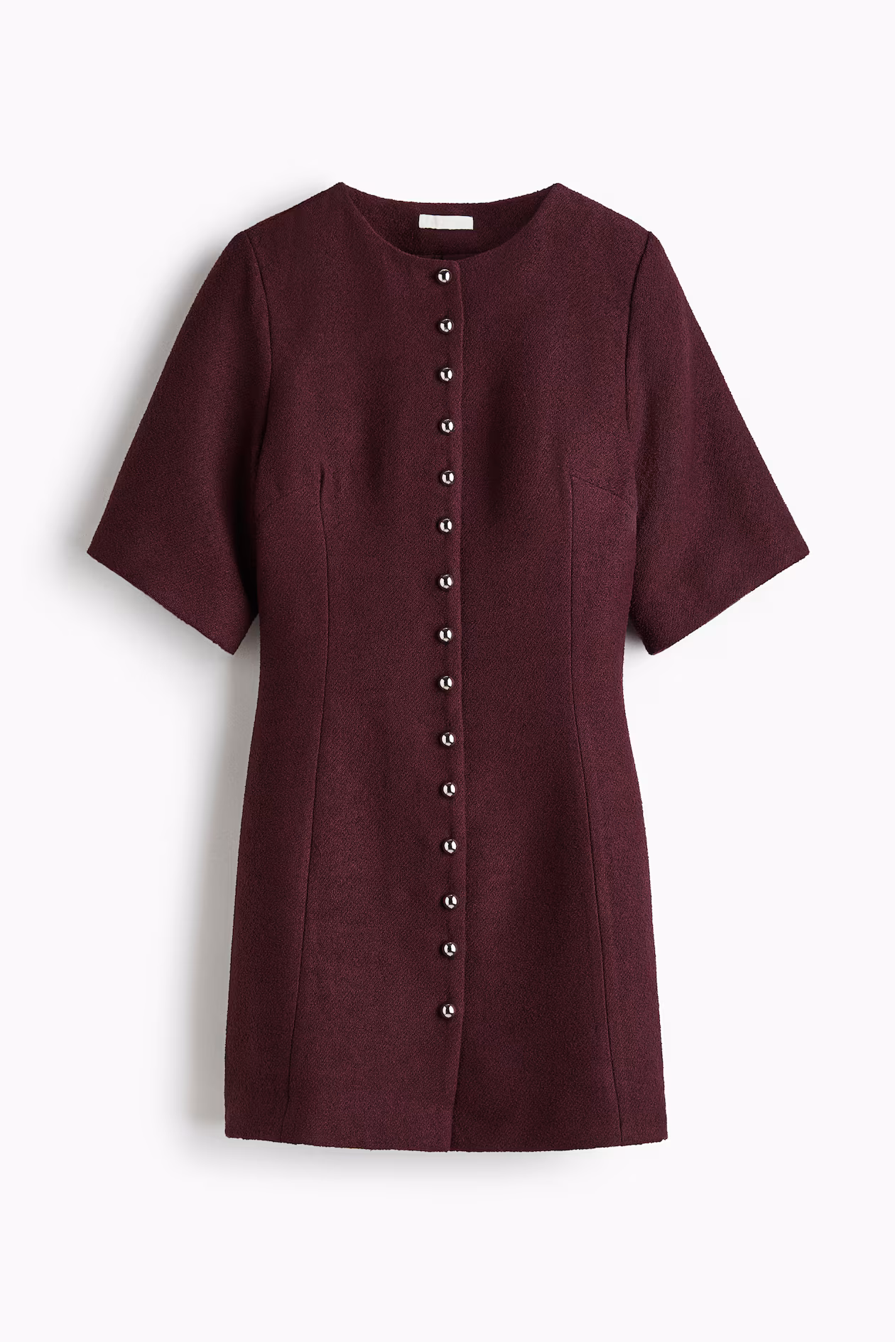 Short A-line dress in woven bouclé fabric with shaping seams at front and back. Round neckline, domed metal buttons at front, and sleeves finishing just above elbows. Lined.