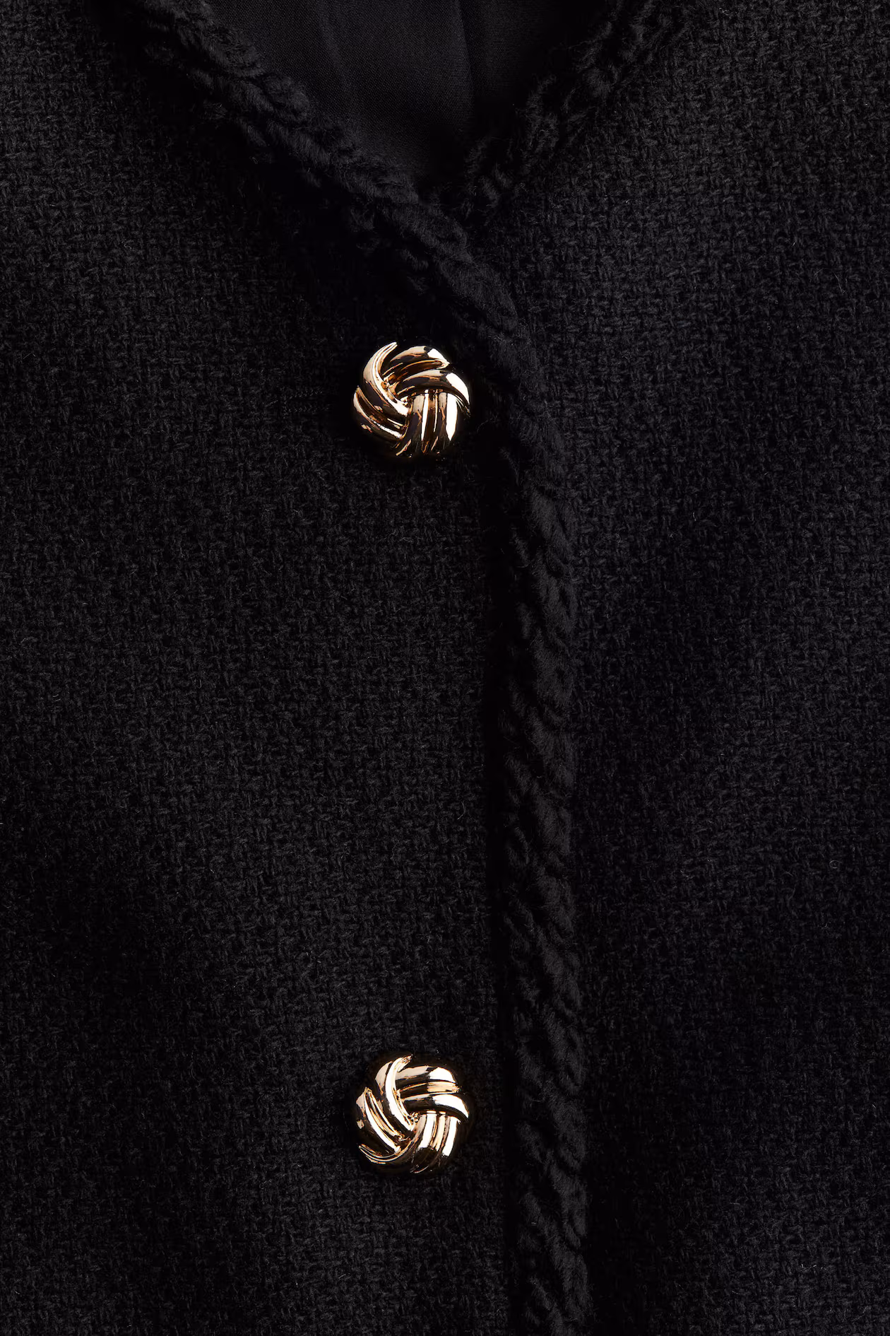 Short jacket in woven bouclé fabric with accent-colored trim. V-neck, knot-look buttons at front, and welt front pockets. Lined.