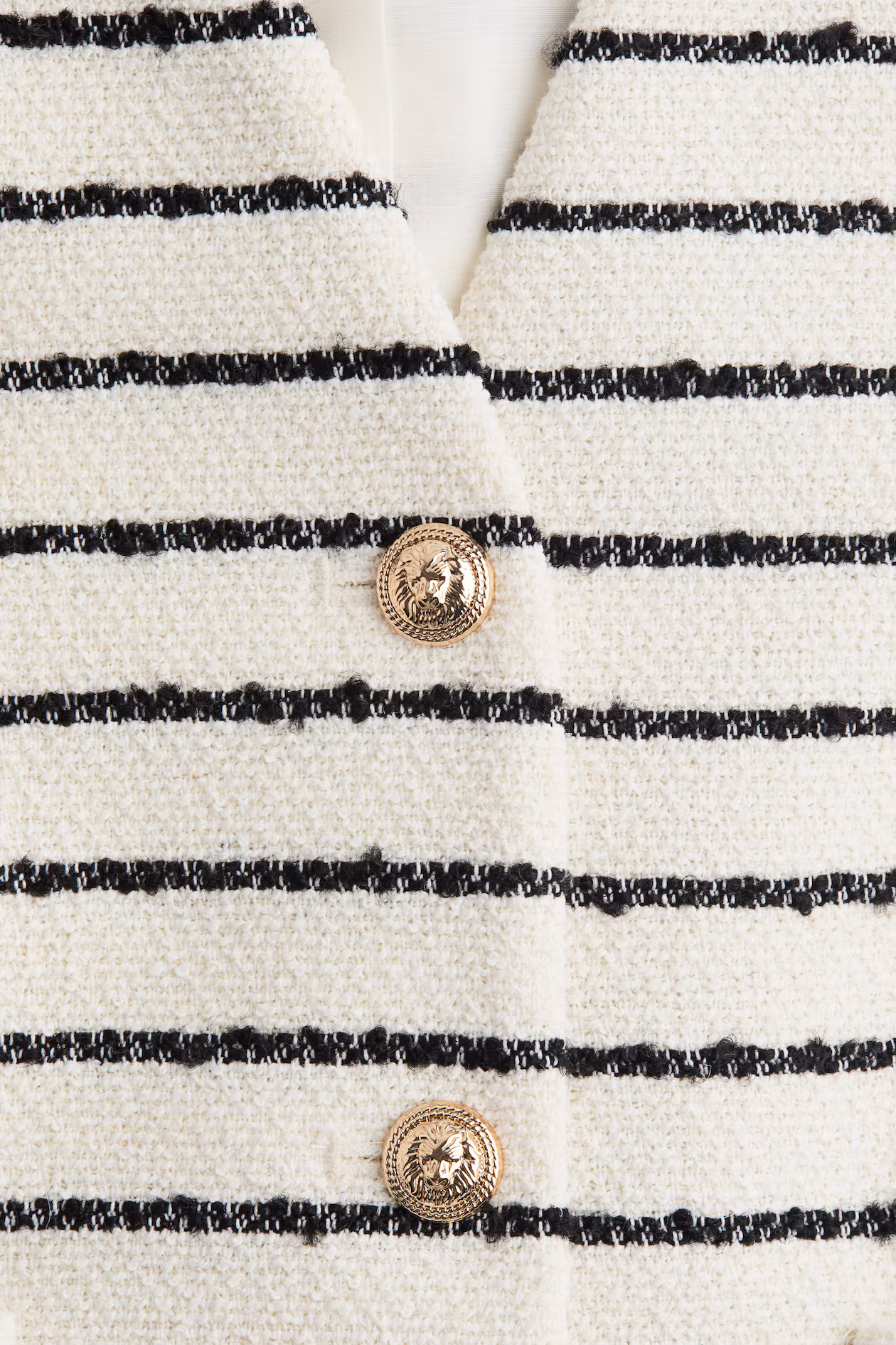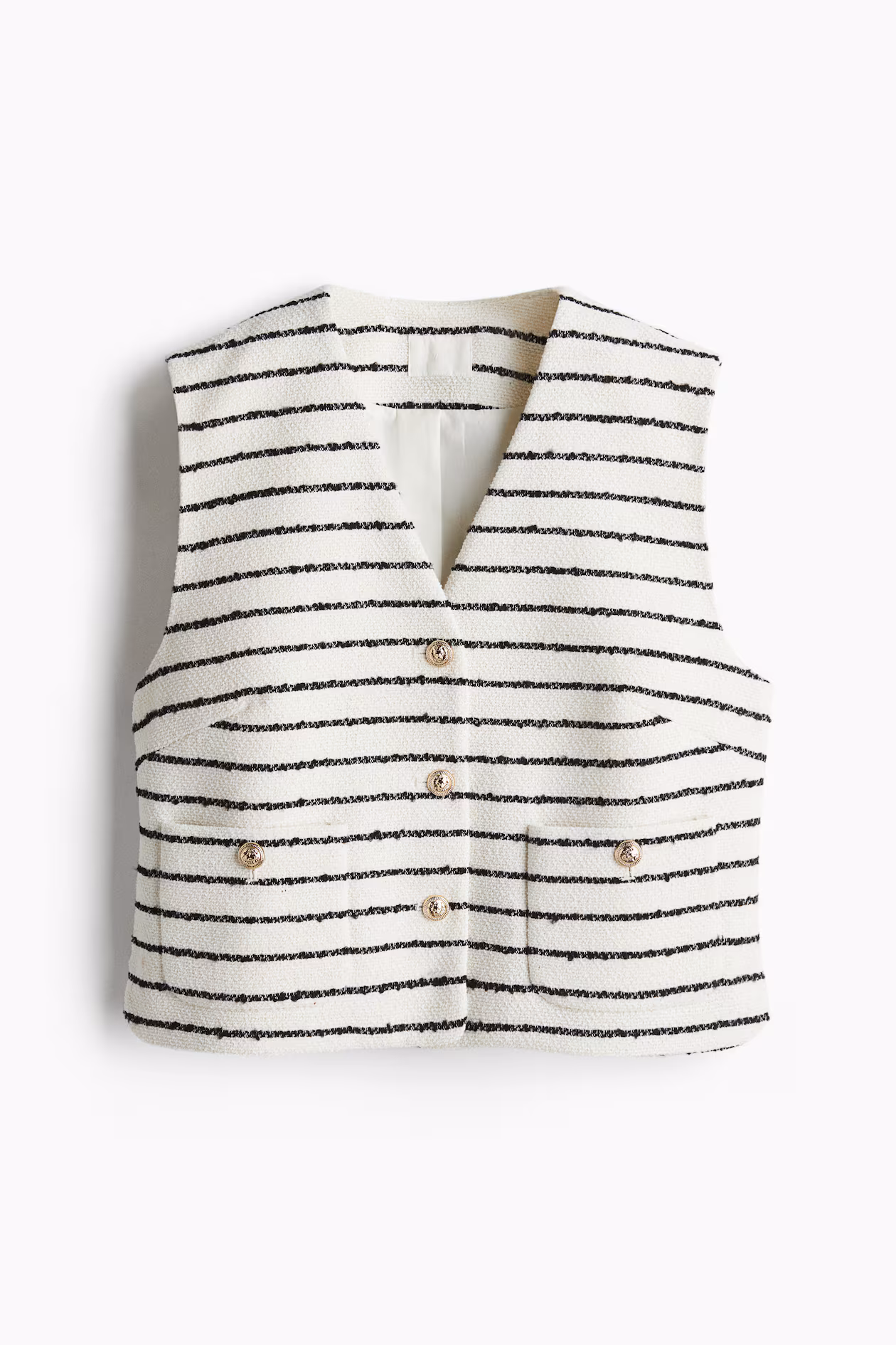 Tailored, fitted vest in woven bouclé fabric. V-neck, buttons at front, darts at bust, and patch front pockets with button. Straight-cut hem with gently curved side vents. Lined.