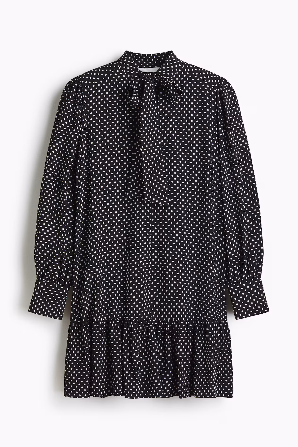 Short, loose-fit dress in woven viscose. Bow collar, V-shaped opening at front, and a yoke at back with gathers. Gathered tier above hem for added volume. Long balloon sleeves with button at cuffs. Unlined.