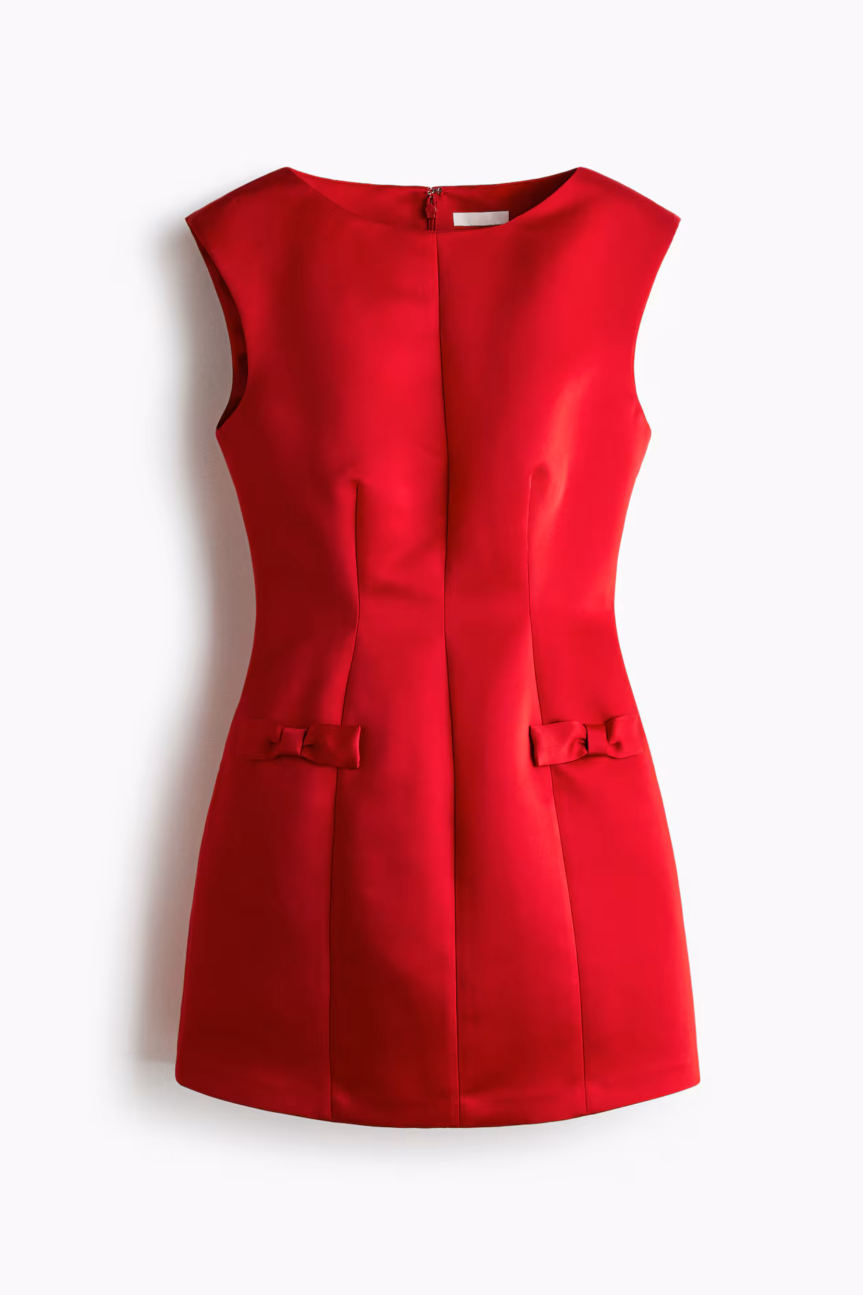 Short, sleeveless dress in woven fabric with a slight sheen. Round neckline, concealed zipper at back with hook-and-eye fastener, shoulder pads, and a tapered waist for a defined silhouette. Shaping seams and decorative bows at front.