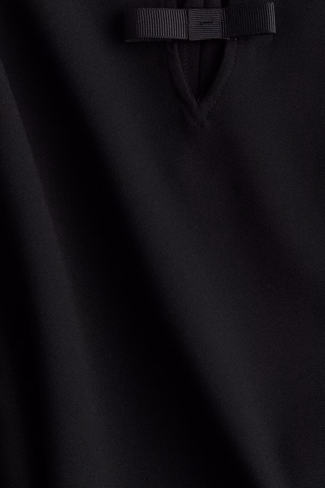 Short, sleeveless, A-line dress in woven fabric. Round neckline, V-shaped opening at front with decorative ribbon bows, and a keyhole opening at back of neck with concealed button. Unlined.