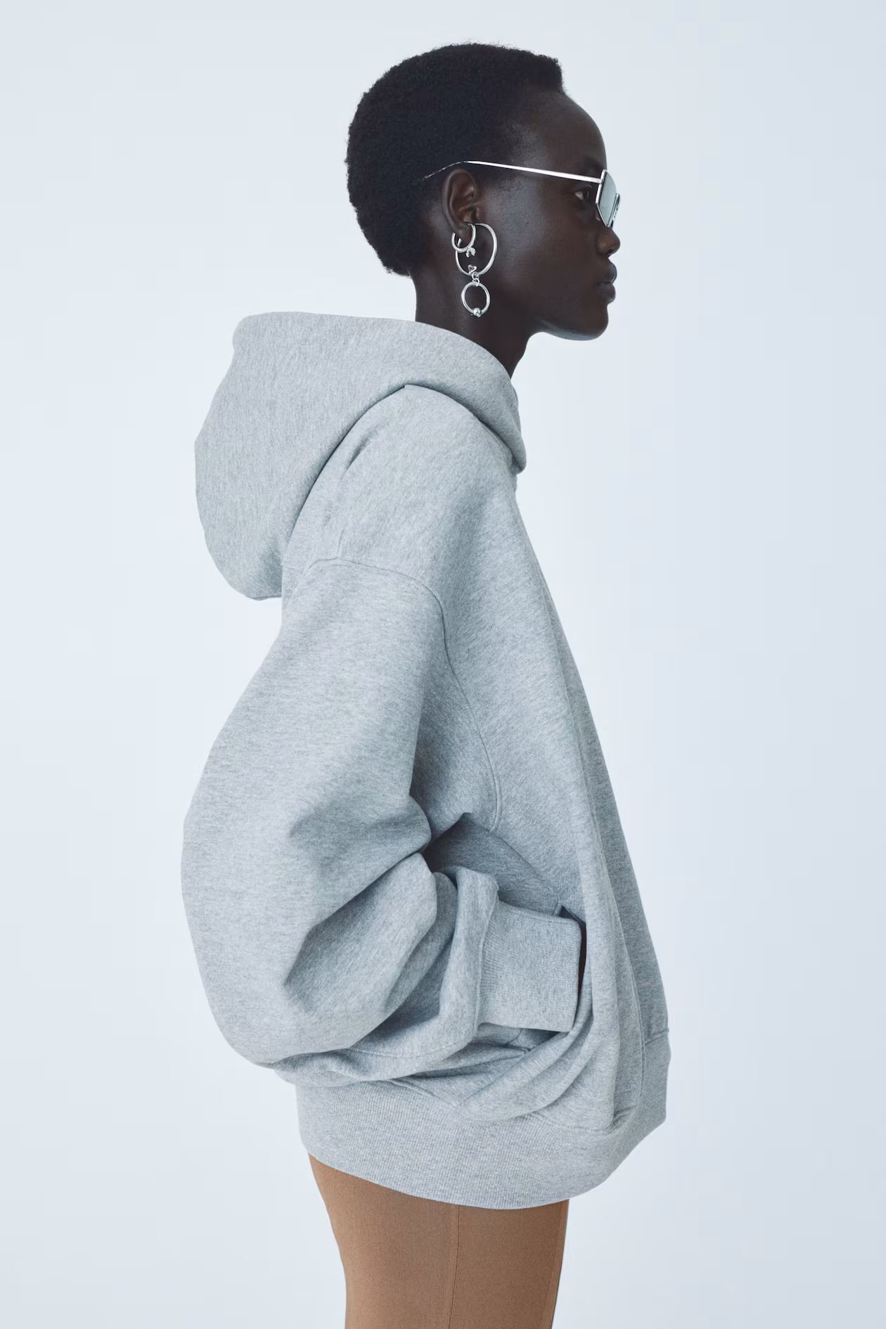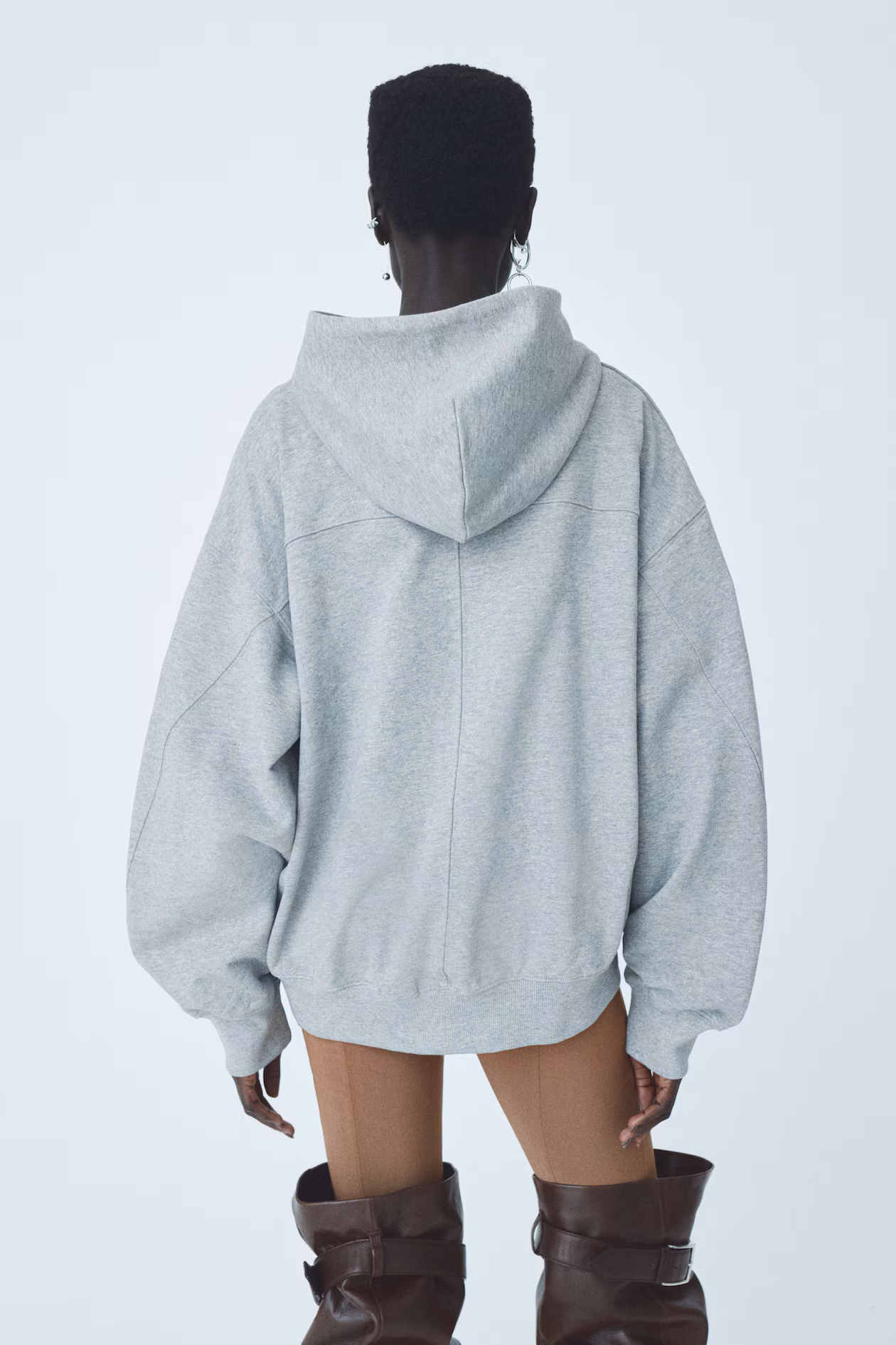Boxy sweatshirt hoodie in a cotton and viscose blend with a soft, brushed inside. Double-layered wrap-front hood, discreet side pockets, and a yoke at back. Dropped shoulders, long sleeves, and ribbing at cuffs and hem. Visible seams at back.
