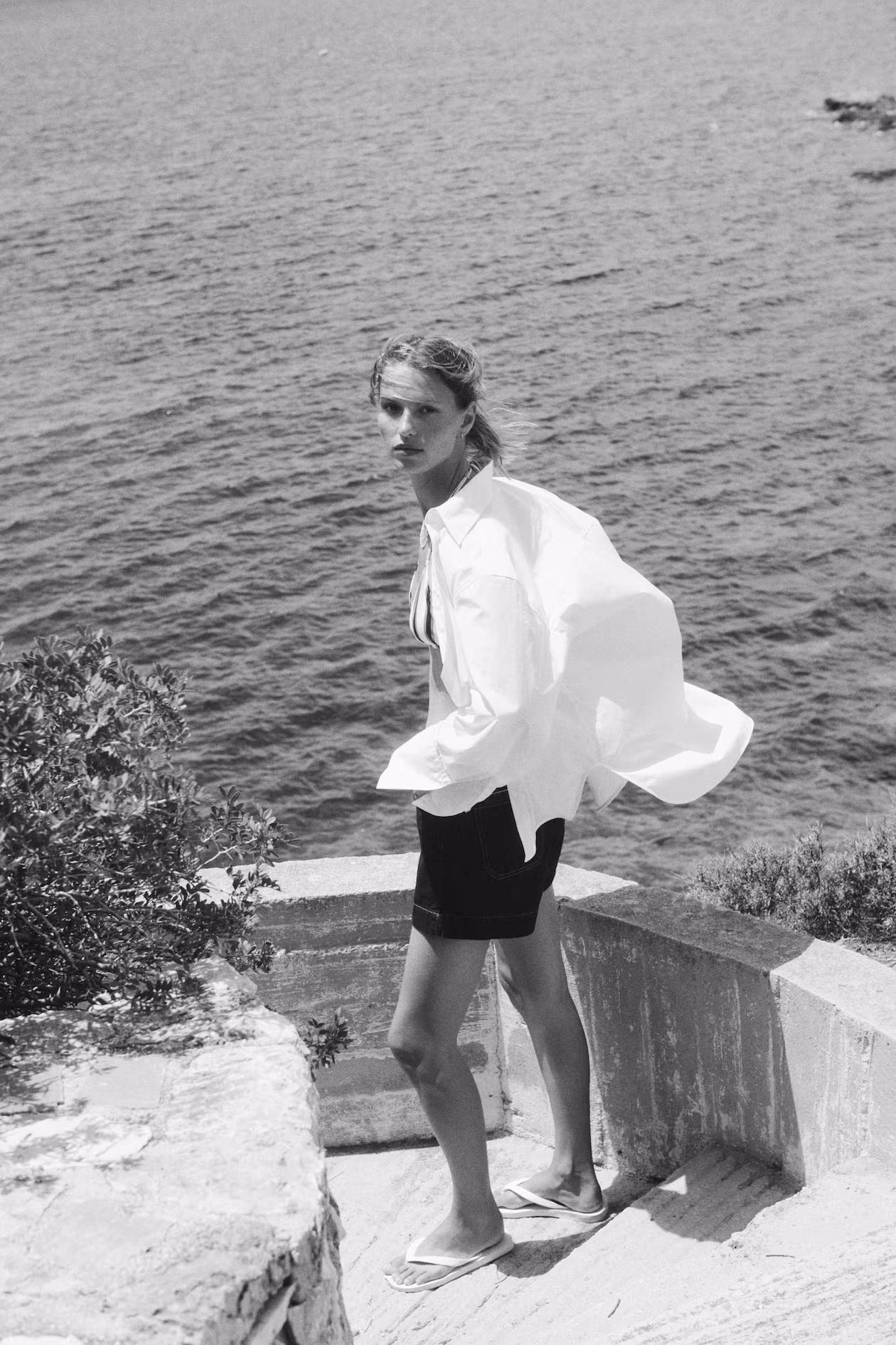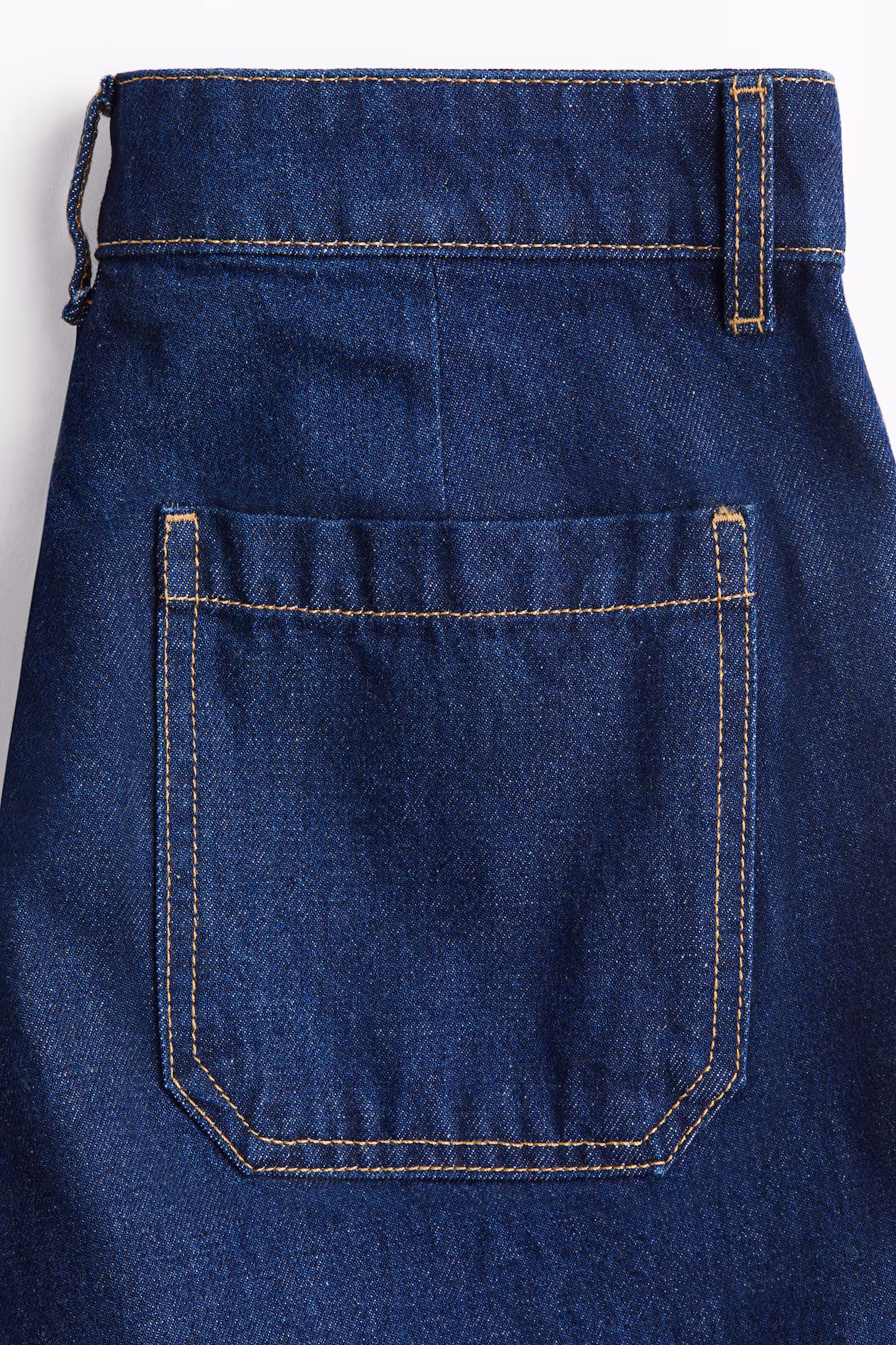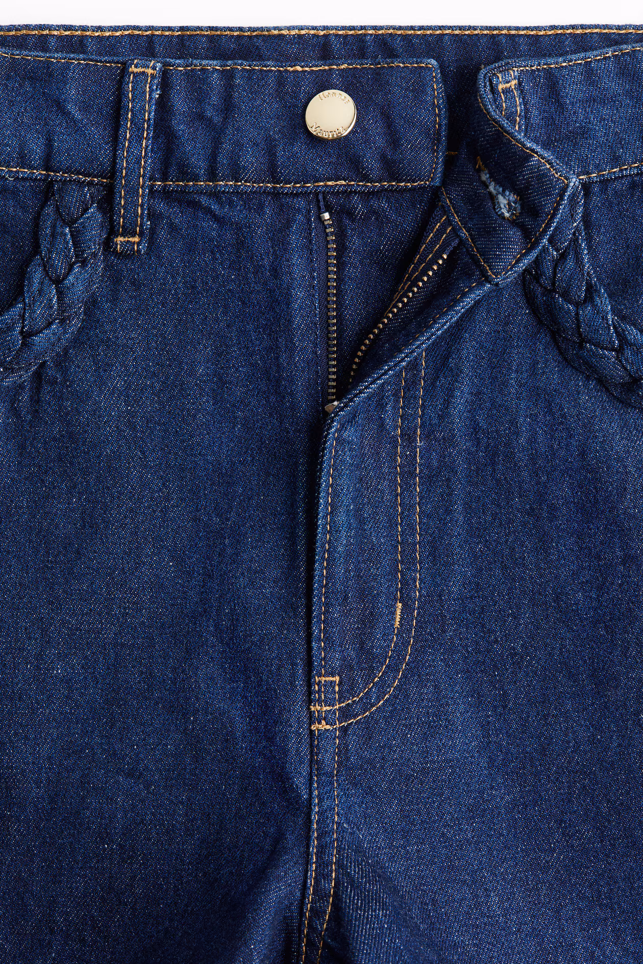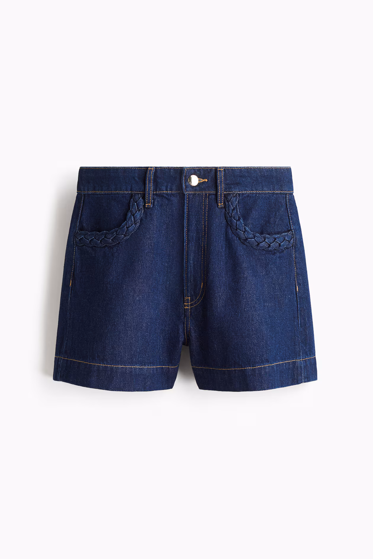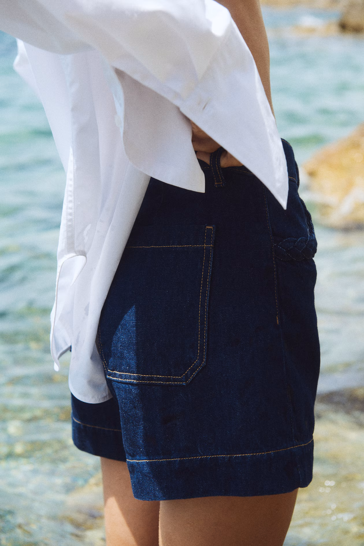 Shorts in cotton denim. High waist, zip fly with button, patch back pockets, and front pockets with braided trim at opening.
