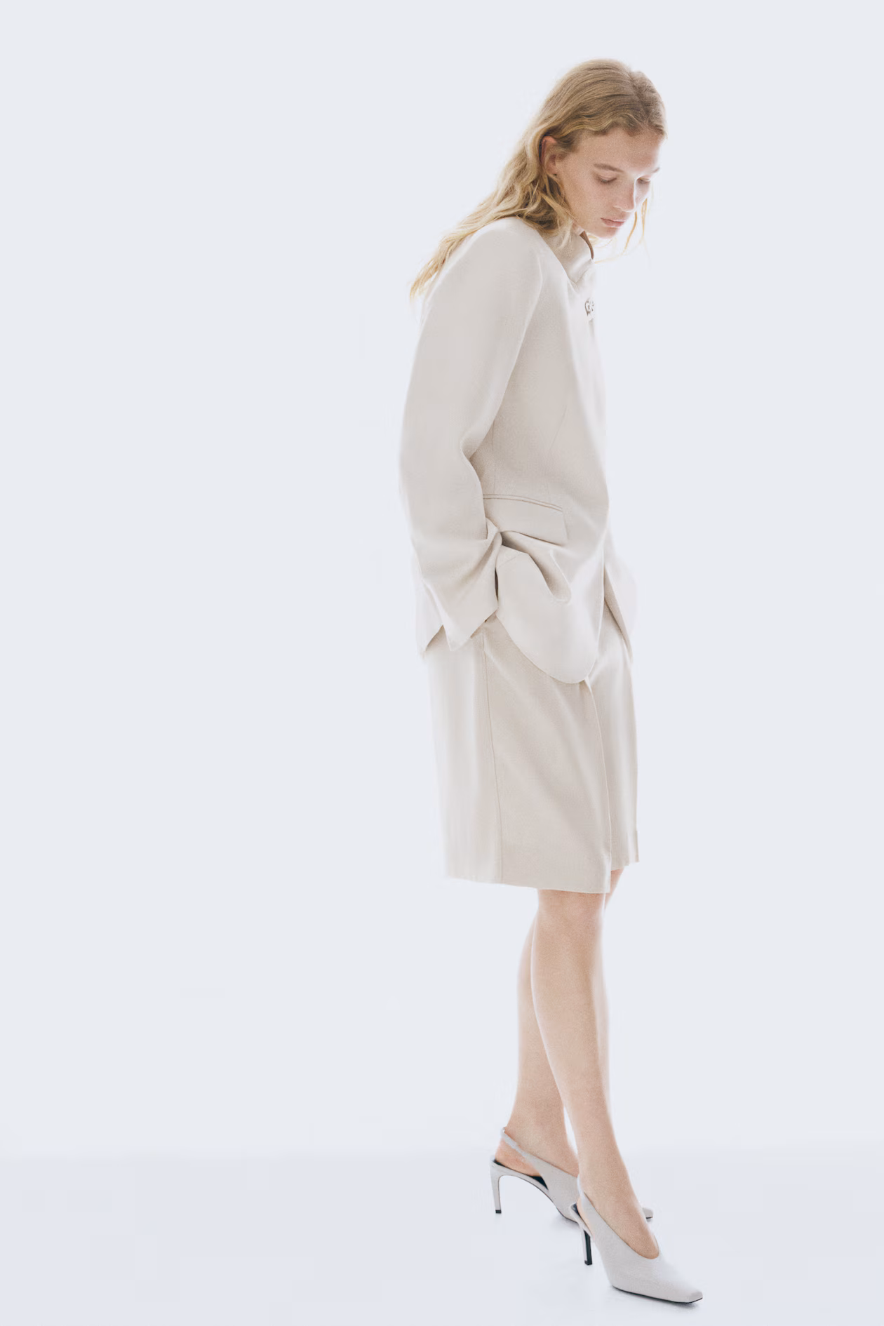 Double-breasted, wrap-front jacket in woven fabric. Stand-up collar, concealed snap fasteners at top, and a flower-shaped metal brooch at one side. Shoulder pads, long sleeves with a slit at cuffs, and welt front pockets with flap. Vent at back. Lined.