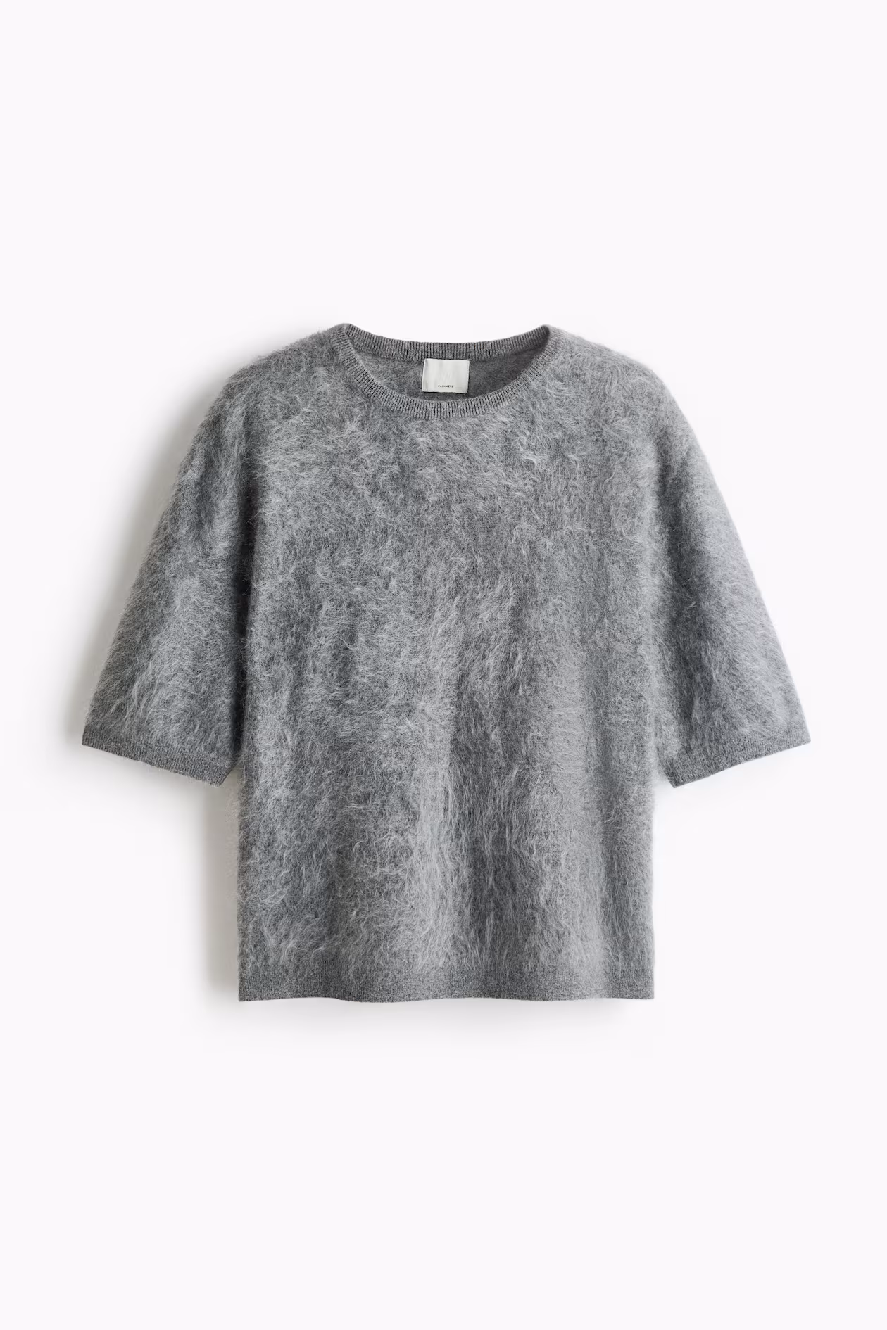 Knit top in soft cashmere with a brushed finish. Crew neck, short sleeves, and ribbing at neck, cuffs, and hem.
