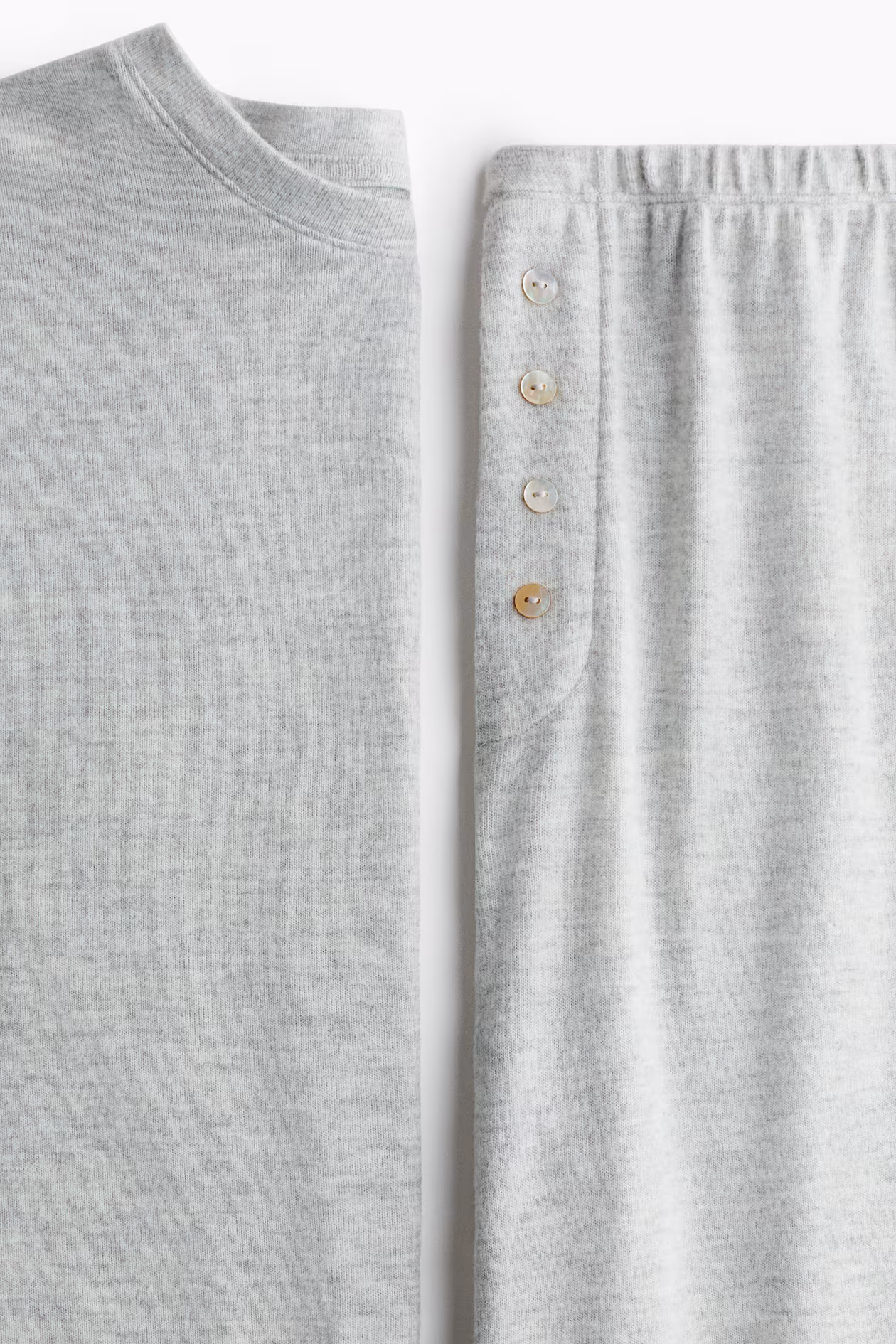 Pajamas in soft brushed jersey with a top and pants. Top with a round neckline, dropped shoulders, and long sleeves. Pants with an elasticized waistband and mock fly with decorative buttons.