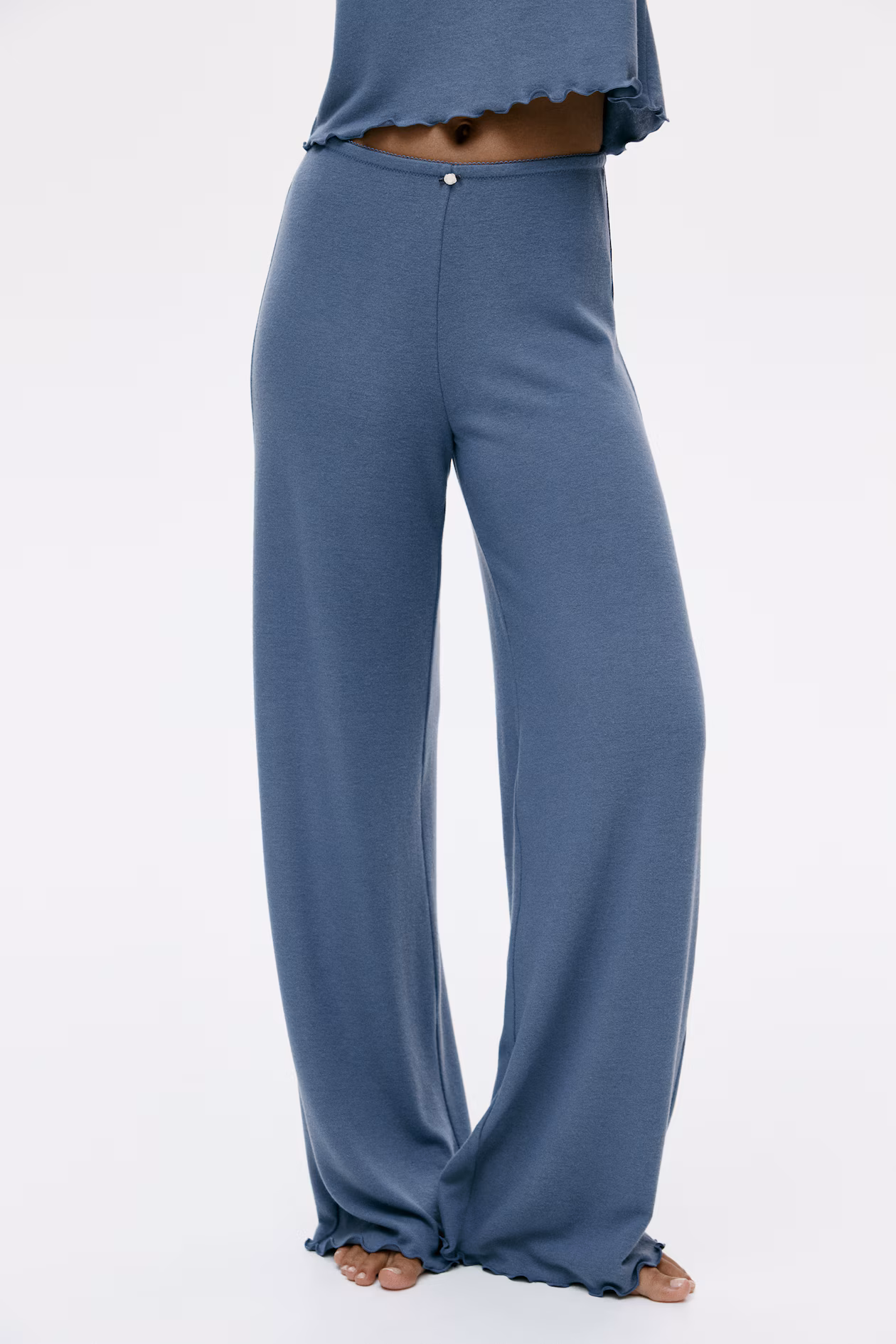 Pajamas in soft, brushed jersey with a top and pants. Long-sleeved top with a low-cut, picot-trimmed neckline with a small satin rose at front, and overlocked edges at cuffs and hem. Pants with a picot-trimmed elasticized waistband with a small satin rose at front, and overlocked edge at hems.