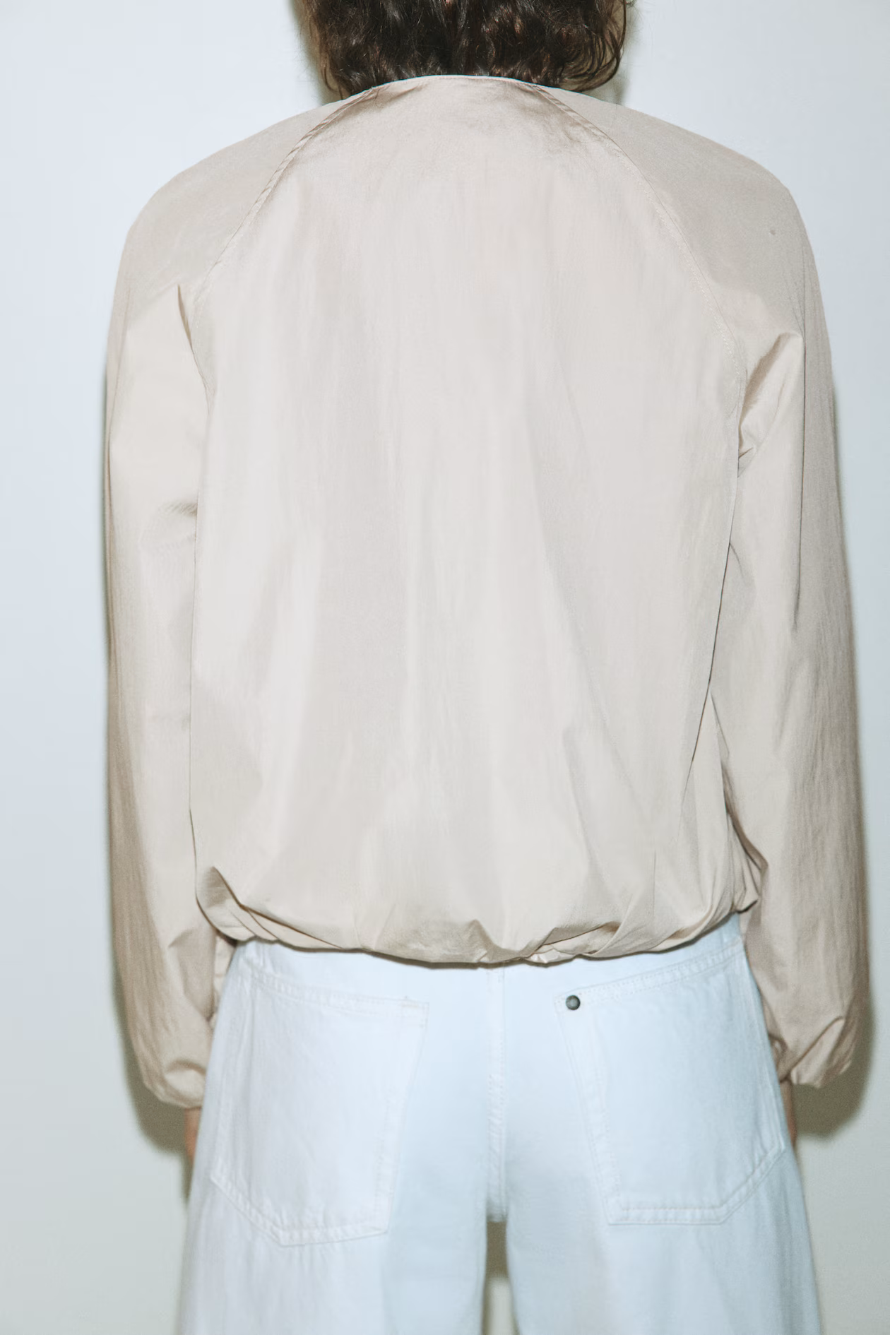 Oversized bomber jacket in woven fabric with a bubble hem for a puffy silhouette. Round neckline, zipper at front, and welt side pockets. Raglan sleeves with covered elastic at cuffs. Lined.