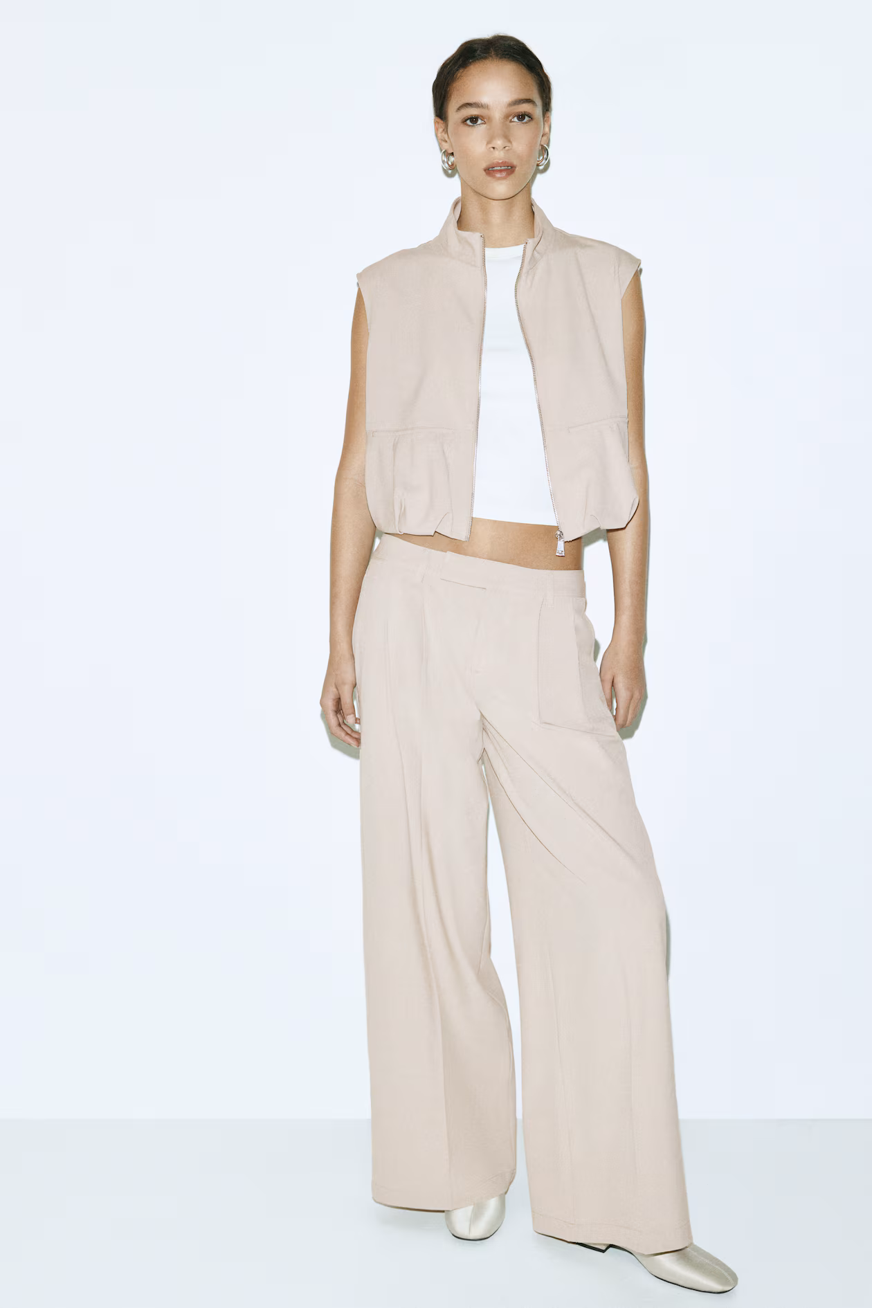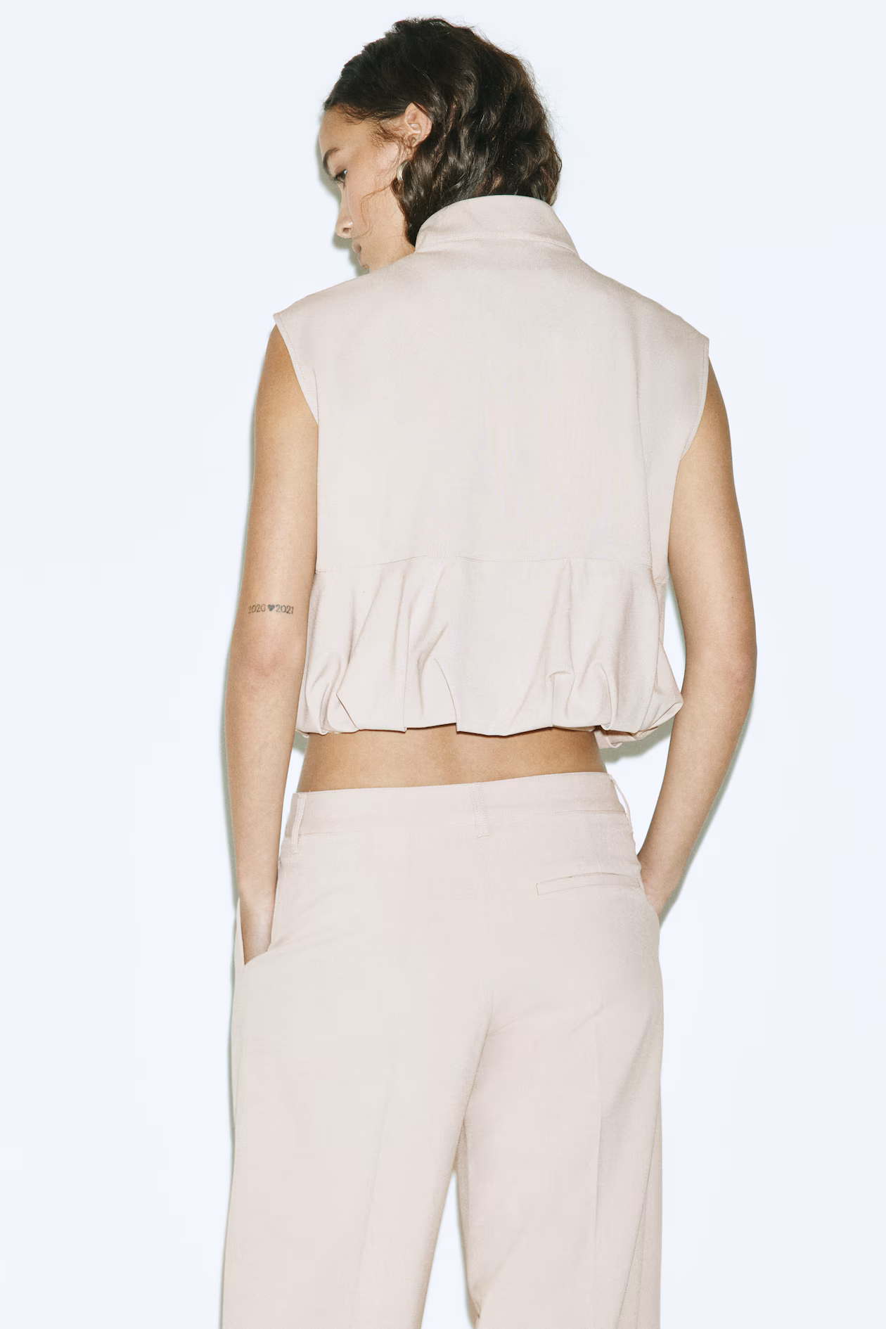 Gilet in woven fabric with a stand collar and a zip down the front. Fake welt pockets at the front, and a bubble hem for a puffy silhouette. Partly lined.