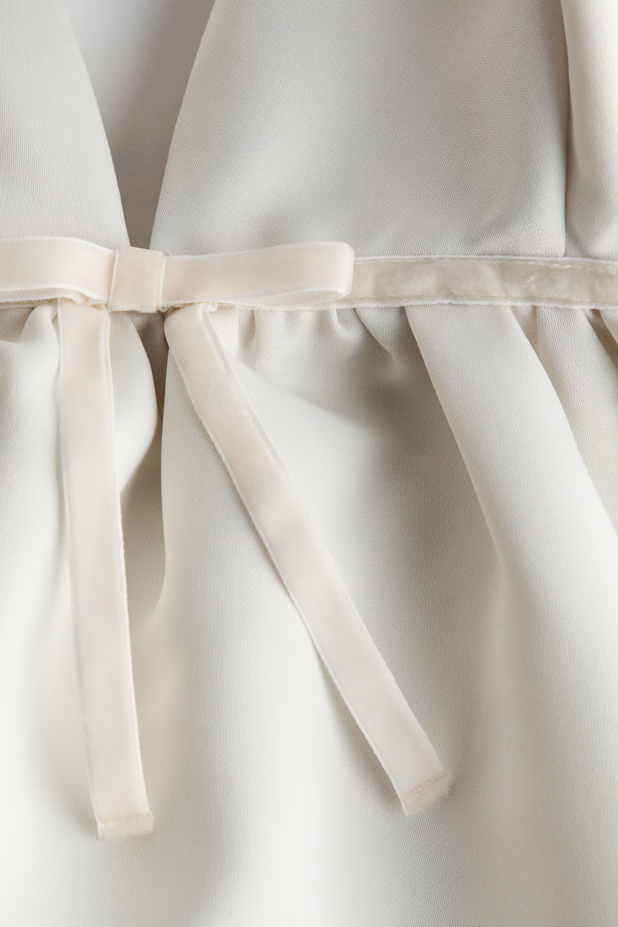 Short top in satin. Narrow, adjustable shoulder straps, low-cut V-neck, and a gathered, velvet-trimmed seam below bust with a decorative bow at front. Concealed elastic at back and a bubble hem for a puffy silhouette.