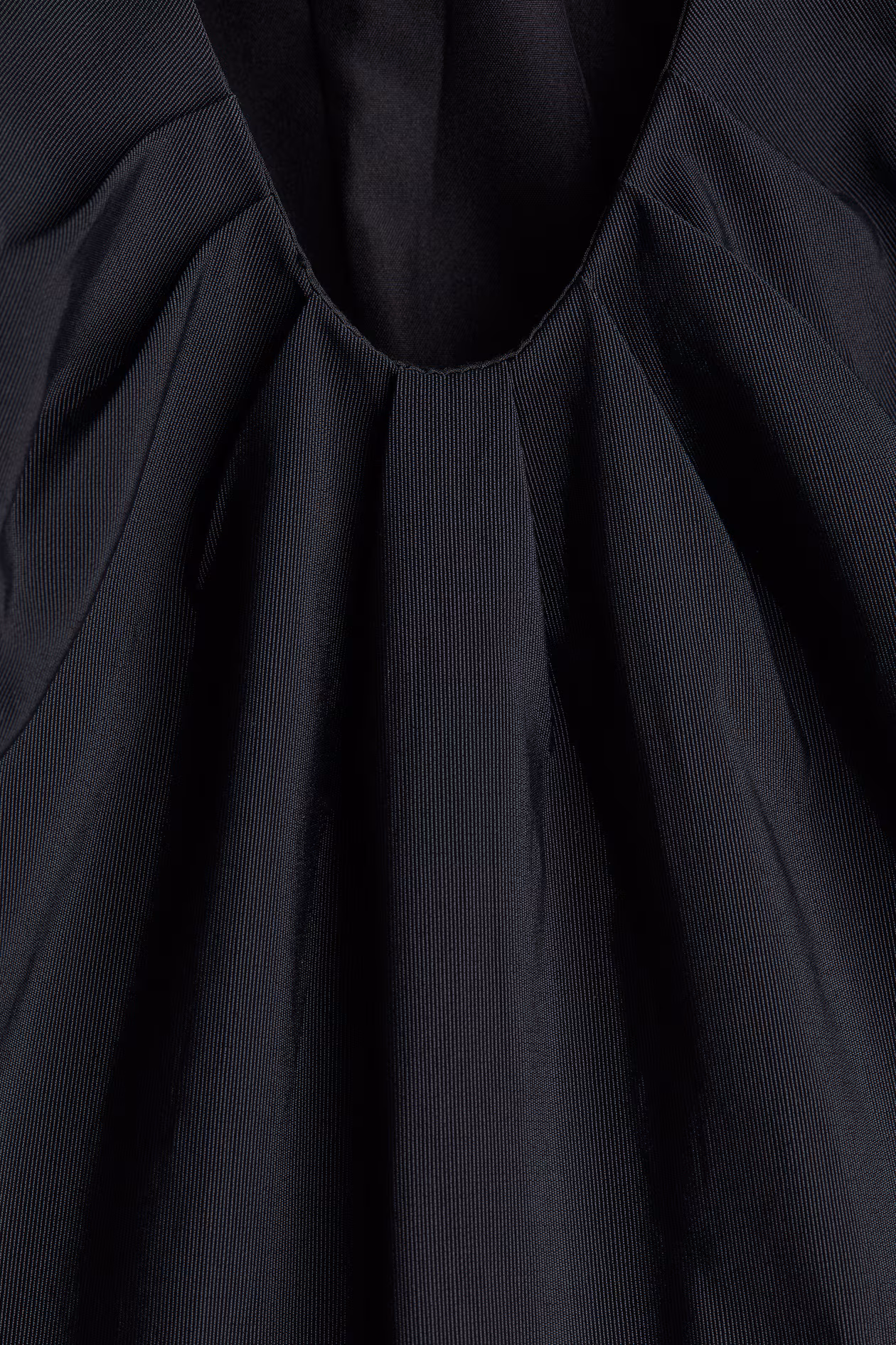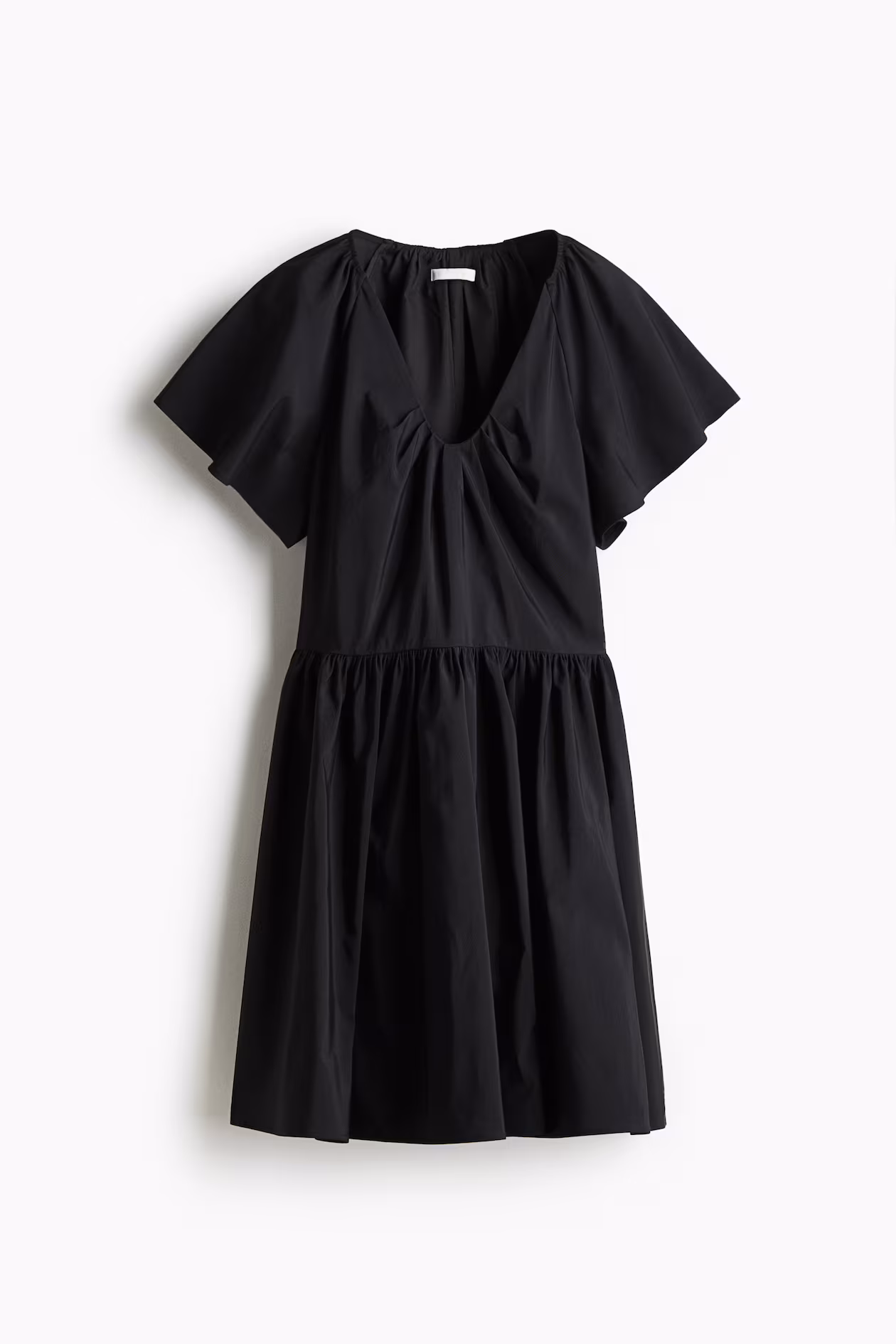 Short dress in woven fabric with a slight sheen. Fitted bodice, low-cut V-neck with pleats at front and gathers at back, and raglan butterfly sleeves. Concealed zipper at one side, gathered seam at waist, and a flared skirt. Partly lined.