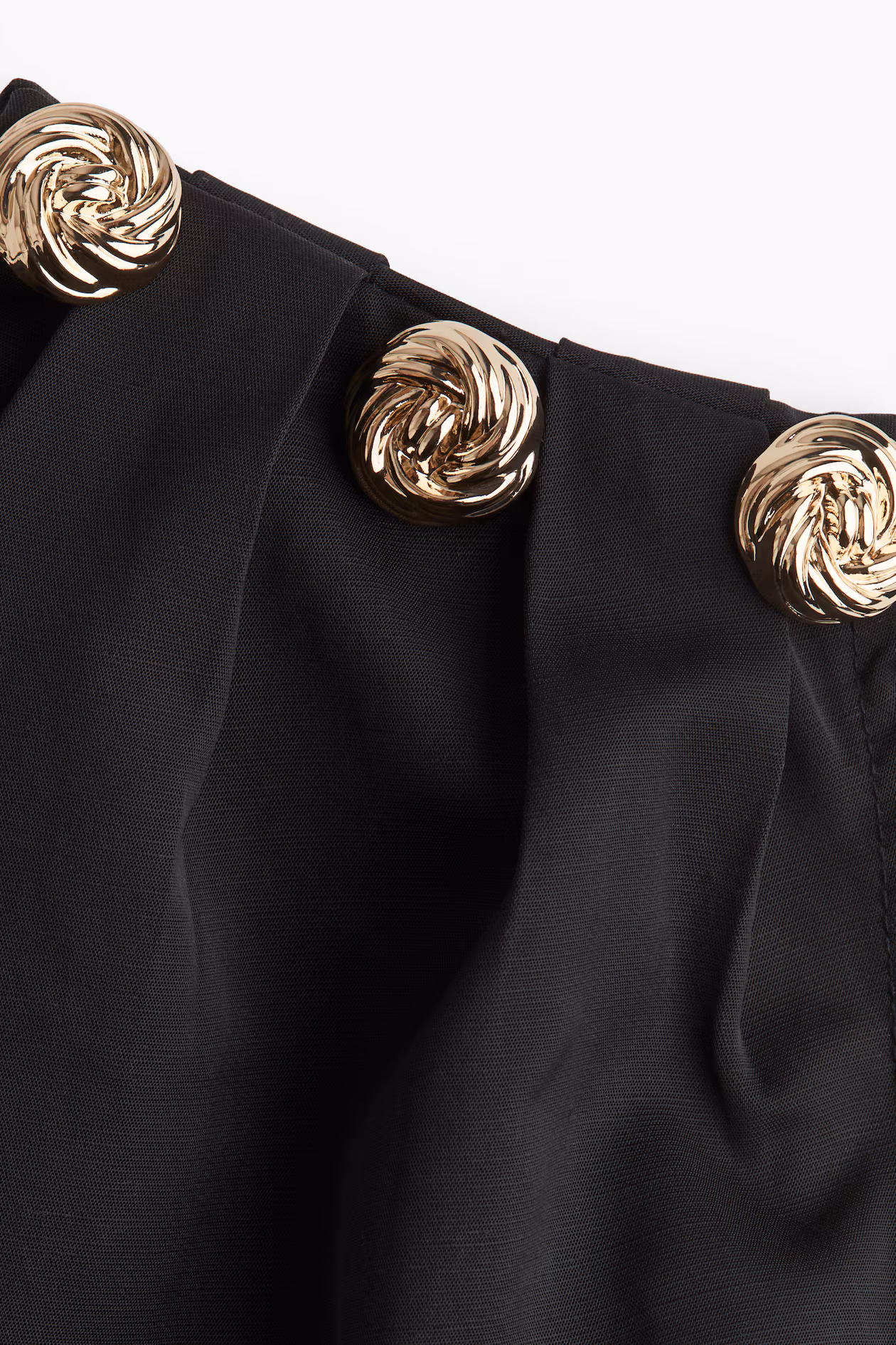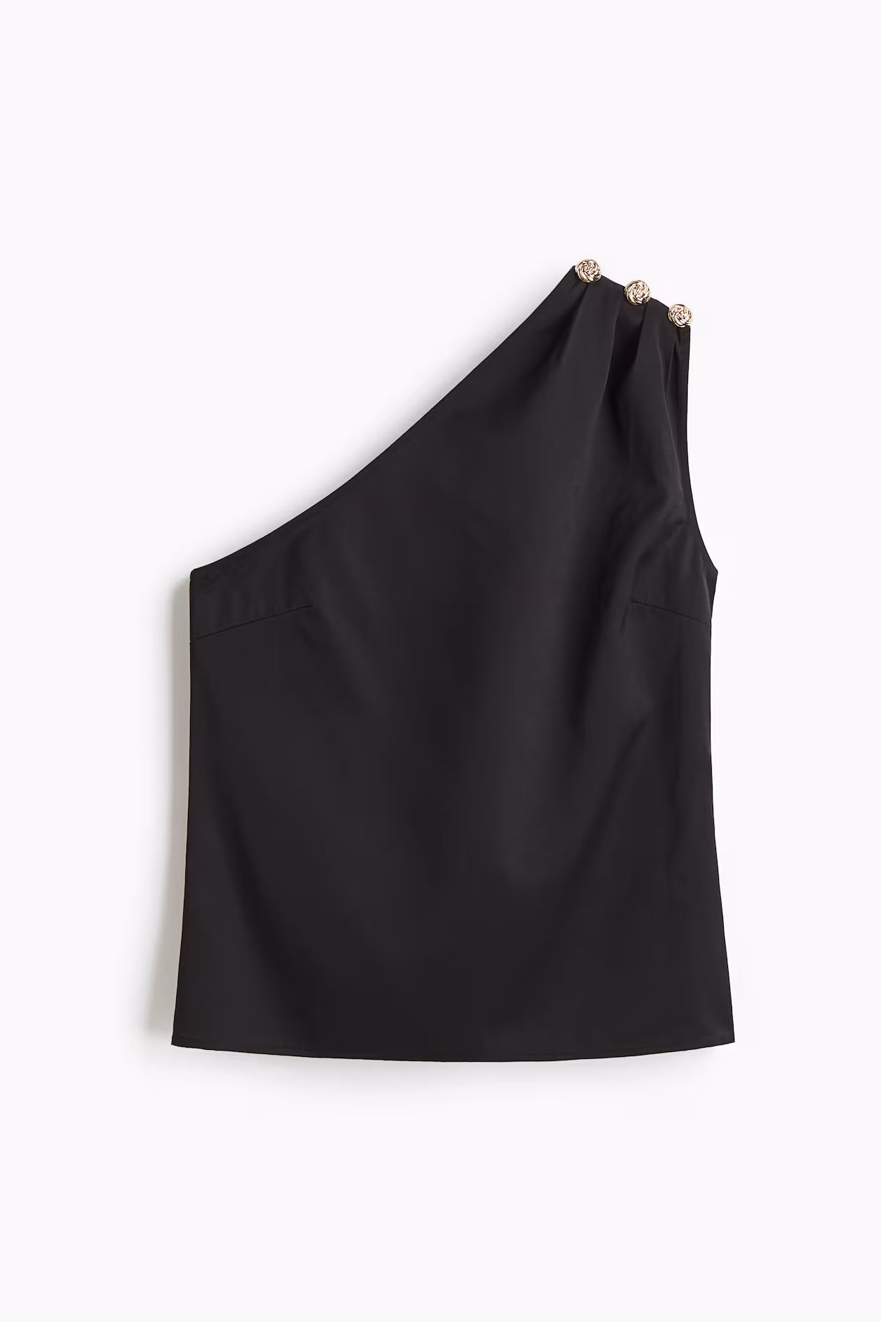 Top in woven fabric with a concealed zipper at one side. One wide shoulder strap with knot-look buttons and pleats at top create a gently draped effect.