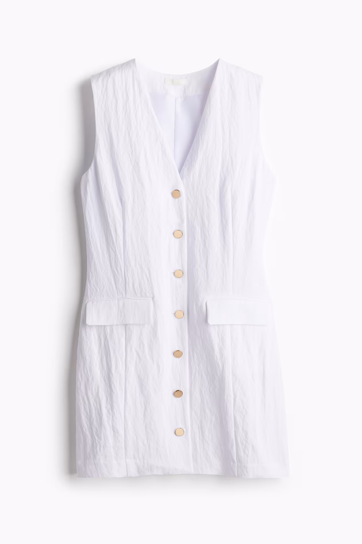 Short, sleeveless dress in woven fabric. V-neck, buttons at front, and shaping seams at front and back. Welt front pockets with flap. Lined.