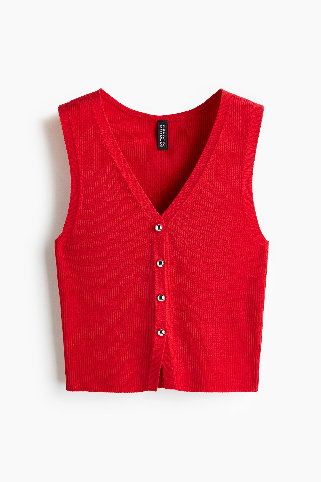Soft, fine-knit sweater vest. V-neck and shiny metal buttons at front.
